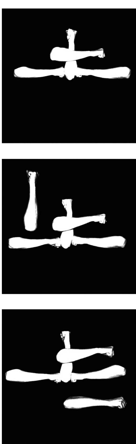Bevor das Stück beginnt, sehen sich die Zuschauer in einer Spiegelglasfolie mit sich selbst konfrontiert. Sie warten, bis das Licht ausgeht und es stockfinster wird; sogar das Licht der Notausgänge wird abgeschaltet (für Phobiker nicht geeignet). Ein Geräusch, das wie eine Mischung aus kochendem Wasserkessel und durchbrennender Elektroleitung klingt (Soundgestaltung Joanna Bailie), steigert seine Intensität. Anfangs erkennt man die Schemen von fünf schwarz gekleideten Körpern, später sind noch die Gesichter und dann ausschließlich zehn geweißte Unterarme und zu Fäusten