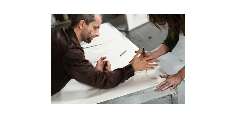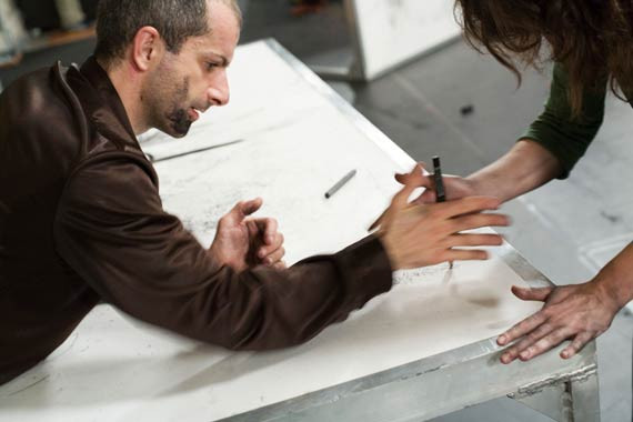Das tun in Dresden William Forsythe und seine durch Studenten der Palucca Schule Dresden aufgestockte 18-köpfige Company mit einer Performance-Installation im eben eröffneten Festspielhaus Hellerau. Am Eingang zum Theatersaal hängen die Menschenrechts-Artikel als Ausgangspunkt der dreistündigen Veranstaltung. Nach hinten verteilen sich unter technisch verstrebter Decke und zylinderförmigen Lampen in dem hohen, sonnendurchfluteten Raum mehrere Reihen metallener Tische, die 40 Akteuren als ungewöhnliche Arbeitspodien dienen. Weißes Papier darauf zeigt anfangs nur grob skizzierte Schrift: jenen Wortauszug aus den „Human Rights“ in seiner Muttersprache, dem der jeweilige Tänzer mit Kohle klare Kontur geben will. Damit das qualvolle Ringen um jedes einzelne Recht sichtbar wird, dürfen die Akteure nur im Widerstand gegen eine selbstgewählte Art der Behinderung anschreiben. „Human Writes“, dies der Titel, steht somit spitzfindig als performatives Sinnbild politisch und individuell asymptotischen Bemühens.