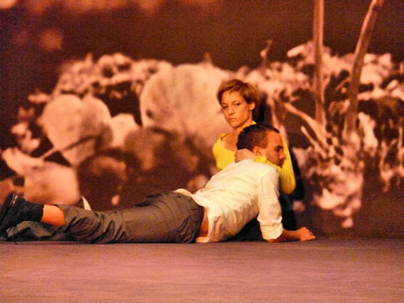 Inhaltlich arbeiten auch die Amerikanerin Meg Stuart und der Österreicher Philipp Gehmacher in „Maybe Forever“, dem emotional furiosen Festivalfinale. Wiederholt proben ihre Figuren, isoliert, verschlossen, hilflos, in Augenblicksbildern Annäherung und Zweisamkeit, rutschen aus der Umarmung ab, nehmen neuen Anlauf. An der Unschärfe seiner Gefühle prallt ihr Wollen ab. Als er bereit wäre, ist es zu spät: Beim Gitarristen Niko Hafkenscheid, dessen melancholische Liedchen den Abend kolorieren, hat sie Zuflucht gefunden. Gehmachers sparsam zeichenhafte Bewegungssprache ergänzt sich hier geradezu symbiotisch mit Stuarts explosiverem Ausdruck.