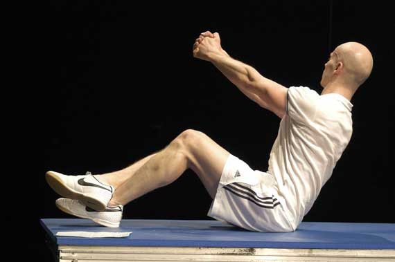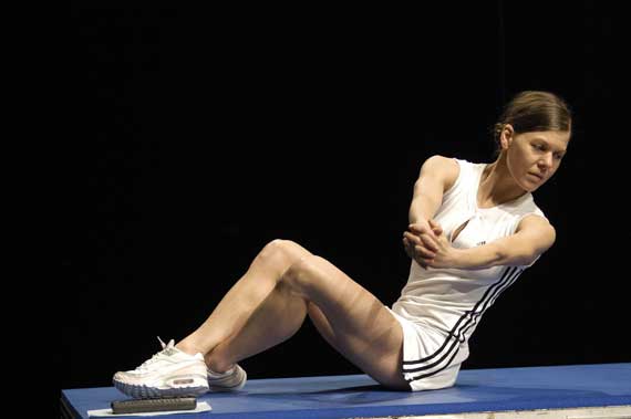 Der anregenden Wirkung dieser Soli hält längst nicht mehr stand, was Christina Ciupke derzeit produziert. Nach „Subtitles“, einem faden Duo mit Nik Haffner um Unterwerfungsmechanismen, folgte nun „longer than expected“, ein Duett mit dem estnischen Tänzer Mart Kangro, ebenfalls 45 Minuten lang und wieder fürs HAU 3. Zwei Ertüchtigungssüchtige stählen sich verbissen und halten dabei, wie es der Titel ankündigt, länger durch als erwartet. Gelehnt an ihre Folterbänke in der Art präparierter Tischtennisplatten erwarten sie den Einsatz. Piepse aus der Konserve und spezielle Trailer strukturieren ihr Leben und geben vor, wie lange die einzelne Übung dauern muss, um maximalen Muskelerfolg zu erzielen. An Liegestütze schließen sich Brücke mit Beinwurf, Seilspringen, Strecksprünge, Hampelmann, Radfahren an. Aushängen an einem bühnenbreiten Reck gehört ebenso zu den Entspannungsteilen wie Relaxen im Liegen zu Adagioklängen. Doch auch das Ausruhen ist noch geschäftig vollgepackt: mit Folgen aus der Bauch-Beine-Po-Serie, wie Fitnessstudios sie im Repertoire haben. Und mit nachzusprechenden Englisch-Lektionen vom Band.