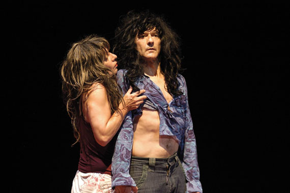 Es sind Szenen einer intensiven Beziehung, die sich wie ein Puzzle vom Auf und Ab zu einem Bildteppich knüpfen. Zwischen einem Gestern und einem Heute wechselt die Zeit, zwischen Hippie-Ära und gegenwärtiger Reife, einem anderen Weltrayon wohl auch und dem Hier. Wuselperücken streifen sich die zwei immer beim Übergang ins Fremde über. Etwas deppert sitzen sie beim Frühstück, ehe sie wieder in ihr Sturzduo fallen. Umbau als Signal sich ändernder Lebensumstände bleibt eine der zentralen Aufgaben. Dazu gruppieren sie viele Einzelteile - Bänke, Taschen, Laptop, Köfferchen, Tierfell, Kleidungsstücke - regelmäßig neu um, machen es sich gemütlich, schaffen Ordnung aus dem Chaos. Erinnerung: Er spielt für sie Gitarre. Das haut sie vom Sitz, lässt sie schmachten und posen. Als sie sich ohne Perücken am Tisch begegnen, treibt sie in eine Umarmung, was sie über die Jahrzehnte gemeinsam stark gemacht hat. Doch schon zeigt sich auch Trennendes: Starrsinnig beharrt jeder auf dem „richtigen“ Platz für Tasse und Kanne.