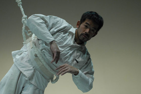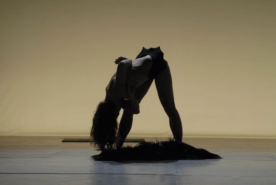 Aus einem Kasten an der Decke klettert per Knotenstrick Hironori Sugata herab, bleibt an seiner Longe gefangen. Das erlaubt ihm, in allerlei Schräglagen zu fliegen, über Kopf zu hängen, Kung fu-Tritte zu wagen. Seine Freiheit in der Begrenzung weiß der behinderte Samurai zu nutzen, schwingt zu metallischem Klang akrobatisch mutiger, löst sich gut getimet vom Seil, um freiwillig in sein Baumhaus zurückzukehren. Die geschlossenste Miniatur des Abends. Um die Verletzlichkeit in zarter Eigenhaut drehen sich, inspiriert von Texten Maxie Wanders und Samuel Becketts, die Soli von Katja Scholz und Ute Pliestermann. Die eine fragt, barbusig auf dem abgelegten Pelz vorwärts rutschend, nach Liebe, Sex, Geborgenheit, wandelt sich zum gesichtlosen Zottelwesen, dem es vermeintlich gut geht. Die andere, elegant im Hosenanzug, fordert von jemandem Dinge, die der nicht erfüllen kann, weil er offenbar nicht existiert. Hinter einer vergrößernden Glaskugel fahndet sie nach dem wahren Gesicht, wird zur windumwehten Geisha im Boafummel, schmückt sich mit künstlichem Schmollmund, strandet wie gekreuzigt in einem umgekippten Stuhl. Leicht scheinen es Tänzer mit sich nicht eben zu haben.