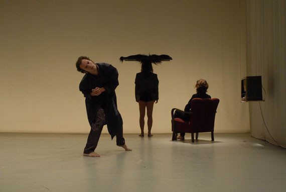 Zu einer Collage aus Musik und Text sucht sie nach Standfestigkeit, knallt den helmbewehrten Kopf auf den Boden. Als sie die klobigen Sportschuhe ablegt, knicken ihre Füße in den Pumps darunter hilflos auf die Innenkante. Alles scheint auf sie einzustürzen, bringt sie in absurden Figuren zu Fall. Die Verwandlung gelingt am Ende: Nochmals schiebt sie den Kopf in den Koffer; als sie ihn herauszieht, hat er den hinderlichen Helm abgestreift. Aufrecht geht sie ab. Fordernde Texte nach Name, Adresse, Telefon überlagern die nervös fahrigen Bewegungen und ruckhaft impulsiven Gänge, mit denen der Pyjamamann somnambul den Raum durchmisst. Kurz nur bietet eine Frau ihm Halt, nimmt dann auf dem Sessel Platz; eine andere zieht mit pelzigem Barett dahinter ihre Bahn. So sehr Carlos Osatinsky seine Extremitäten sortiert, so sehr die Beine ausschlagen - seinem Körper vermag er nicht zu entfliehen.