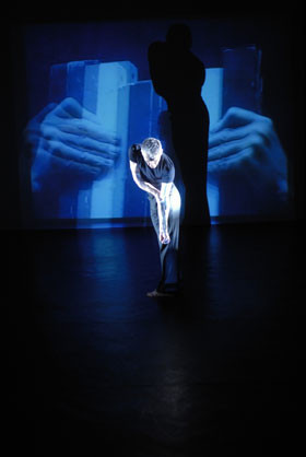 Zu zyklisch aufflackernden elektronischen Störgeräuschen, mit denen Lutz Glandien den Abend neben Hölzchengeklacker musikalisch dezent ausstattet, bahnt sich Baumann dicht an der Leinwand mit Übersetzschritten und Schwankbewegungen zeitlupenhaft seinen Weg.