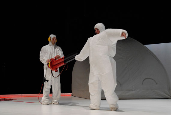 Luc Dunberry und Robert Abubo kommen mit seltsam vollgemülltem Supermarkt-Einkaufswagen auf die Bühne. Zwei Wesen aus einem Science-Fiction-Film, gesichtslos mit insektengroßem Kopfhelm, Fellstiefeln, Fellweste über weißem Ganzkörper-Laboranzug, glänzenden Arm- und Beinschützern. Sie kleben aneinander und rekeln sich als Vierfüßler animalisch. Ihr aufgeblasenes Zelt wird mehrfach zur Video-Projektionsfläche: Wasser, Quallen, wabernde Gesichter. Die „Fremden“ tänzeln katzenhaft einander umrundend bis zur Berührung. Sie pellen sich gegenseitig aus ihren weißen Häuten. Das Video beamt
