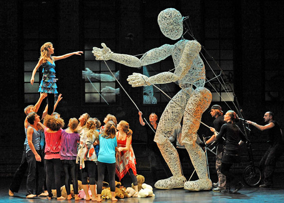 „Haben Sie meine Puppe gesehen?“ - Auf der Suche nach Puppen und Plüschtieren klettern sechzehn tanzbegeisterte Teenager über Zuschauer, quetschen sich durch die Reihen, balgen und stolpern zu Aron Coplands „Dance Symphony“ auf die Bühne des großen Saals im Stuttgarter Theaterhaus. Das Publikum am Premierenabend von „Move the Music“ hat ebensoviel Spaß am ausgelassenen Treiben wie die Schülerinnen und Schüler. Was mit kindlicher Spielfreude beginnt, bekommt durch „Dundu“, eine riesige Stockpuppe (Tobias Husemann und Stefan Charisius), die von fünf professionellen Puppenspielern geführt wird