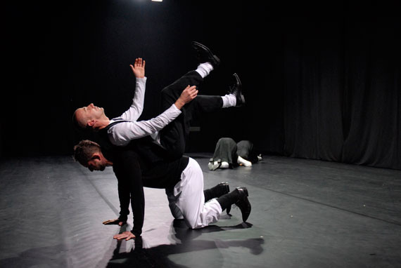 Aus fahrigen Handbewegungen wird eine Schüttelwendung am Platz, bis der gesamte Körper erzittert, als wohne man dem Betdienst der Shaker bei. Hin zum jetzt als Altar in der Raumtiefe aufgebauten Tisch geht alles Wollen, das Rutschen, Ächzen, bis im Punkt der Ekstase die Tänzer stürzen. Selbst aus der Lage noch richten sich Kopf und Blick himmelwärts. Asketisch streng ist diese Raumkomposition, auch wenn sich jemand kniend vorwärts bewegt, einer pfeift, zwei einander eine Spur am Firmament zu zeigen scheinen. Wenig Geräusch nur stört die Stille, leises Zirpen etwa. Die beiden Männer türmen sich; Kopf an Kopf balancieren und schieben sich die Frauen. Eine legt sich aus dem Kopfstand auf einem Hockenden ab, ein Mann wandert in der Kniebeuge. Hüpfer erzeugen Rhythmus, man fasst sich an den Händen, hakt den anderen ein, bis ein Mann schutzsuchend eine Frau anspringt. Die schaukelt ihn behütend, stellt ihn auf den Altartisch, wo er, seine Wundmerkmale ausweisend, hin und her schwankt. Nacheinander versammeln sich alle um den Altar, das Paar oben mit zugewandtem Gesicht, sie zunächst wie geblendet die Hand vor den Augen; vor und hinter dem Tisch die beiden anderen im Blick aufs Zentrum.