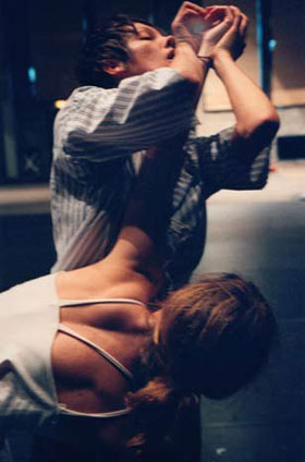 Doch die Zeiten haben sich geändert. Nicht die Liebe etwa zu Gott ist hier das Zentrum, sondern unser alltäglicher Krampf unterm Deckmantel der Liebe. Gefesselt in sich selbst, piepsen die Darsteller ihre Fragen und Antworten ins Mikroport, geraten, sobald ein Gespräch entsteht, in Streit, plappern einfach drauflos, positionieren sich selbstgefällig vor der Videokamera. Es kommt schlimmer: Den Tänzern versagen gänzlich Sprache und Semantik, weil sie nicht mehr artikulieren können, was sie empfinden, was in ihnen wühlt, mit wilden Lauteskapaden aus ihnen hervorbricht, die Gliedmaßen krümmt, schlenkert, um sich selbst verdreht. Den Höhepunkt der Verwirrung löst Forsythe in ein grandios fließendes Männerduett auf: Klammern, Befreien, Verschlingen, Abrutschen, Entziehen, aneinander Abgleiten – in engstem Körperkontakt und so Ausdruck der Suche nach Liebe, auch wenn ein Beobachter „I hate that“ kommentiert, einer der Akteure genießerisch kontert: „It’s a Spiel“.