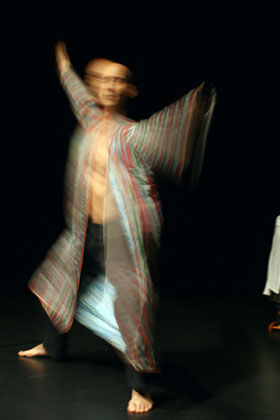 Ein Raum mit weißem Boden, auf dem ein schwarzes Etwas liegt. Ein Mensch? Ein Tier? Nein, ein Stück Holz, wurzelhaft in seiner Gestalt. Wie ein Schatten gleitet im Hintergrund eine Person vorbei. Sie nähert sich dem Stück Holz, hält es, trägt es. In seinem Solo „Miniaturen“ lässt Gilles Welinski eine Miniaturwelt seiner eigenen Evolution entstehen. Das Stück Holz als Symbol für die Natur. Mal ist es ein Sitzplatz, mal ein Aussichtspunkt. Am Boden und an den Wänden tanzen die Schatten und entwickeln eine zweite Welt. Unterbrochen wird dieses Spiel mit dem Holz von Klaviermusik, die Gilles