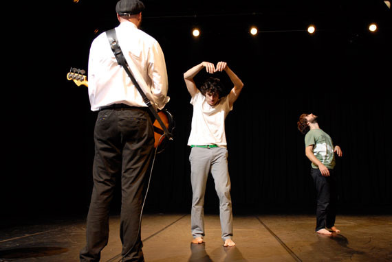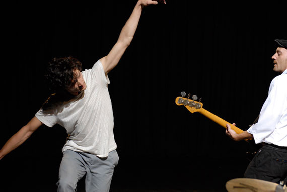 Nein, Bewegung und Rock halbieren sich zwar den Spielraum, aber leiden mögen sie sich bis dahin offenkundig nicht. Erst Ayara Hernández Holz nimmt mit vibrierendem Oberkörper den Rhythmus der Musik auf, flicht ein unsichtbares Band zur Band, selbst wenn der Tanz über Rock-Gogo-Dancing kaum hinausreicht. „Give me more“, hieß es im Text. Wie ein staunendes Marsmännchen wandert dann Martin Clausen im Bandgefilde hin und her bei einem Song, den Sänger Espin Bowder seiner Ex-Freundin gewidmet hat. Weil dem Tanz wieder nichts einfällt, reißt Bowder Clausen an sich, wiederholt zweimal den Refrain, haucht dem Performer eine plötzliche Explosion wilder Sprünge ein. Lange stehen danach die zwei Tänzerinnen, befasst mit winzigen Blickwendungen, Verdrehungen und Krümmungen, ehe sanftes Gitarrenspiel sie in Gang setzt. Durch den Saal tritt der Sänger hinzu, singt aus der Ferne „I’m thinking“. Endlich belebt sich der Raum, wird Angela Schubots bislang nur behauptete Inszenierung spürbar. Auch die beiden Männer finden sich ein, zelebrieren in plastischen Posen stilisierte Zärtlichkeit, mit Intimität, Hingabe, Vertrauen und nicht ohne Witz, wenn sich Beine in selbstläufiger Mechanik gefallen. Swingend jazzig zu diesem besten Teil der Song.