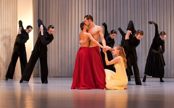 Im Teil nach der Pause belebt sich Camilles Plastik „Die Schwätzerinnen“ in lebensstrotzend groteskem Tanz mit sperrenden Mündern. Doch schon haust sie da in der eigenen Welt, zu der Pauls Diesseitigkeit mit ihren zackigen Wendungen keinen Zugang hat. Den „Walzer“, ein Paar, das in seliger Umschlingung einem Block entwächst und vielleicht die Beziehung zum Bruder abbildet, betastet Rodin, sonst selbstsicher und stolz, in Bewunderung. Das folgende Adagio mit ihm ist die choreografische Perle des Abends. Im Wechsel zwischen Ansturm des Begehrens und wilder Ablehnung zeichnet es plastisch und zeitgedehnt eine Liebe der totalen Hingabe bis zum Wahn nach. Dass Camille ihn am Ende fortstößt, leitet ihren Untergang ein. Selbst Paul bleibt nur noch, sie grob hochzureißen, ihr den Mantel wie eine Zwangsjacke überzustreifen. Blicklos verlässt er sie, Camille stemmt sich gegen die einengend vorfahrende Mittelwand, sinkt dann apathisch zu Boden.