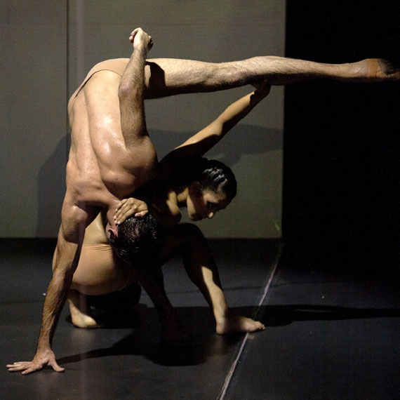Zwei Frauen baumeln kopfüber an Schlaufen um die Fesseln von der Decke, winden und wenden sich, krümmen und recken sich. Drei Gestalten, ebenso nackt wirkend in ihren hautfarbenen Tops und kurzen Hosen, liegen zusammengekauert dicht an den Wänden. Ein lautes Pochen setzt ein. In blutrotes Licht wird der kleine Theaterraum getaucht. Wie Rieseninsekten oder Echsen erheben sich die drei Gestalten - zwei Männer und eine Frau. Sie staksen witternd und lauernd durch den Raum. Ein Machtkampf der Männer beginnt um die Frau. Animalische Gier, Brutalität, Begehren drücken sie in einer atemraubenden