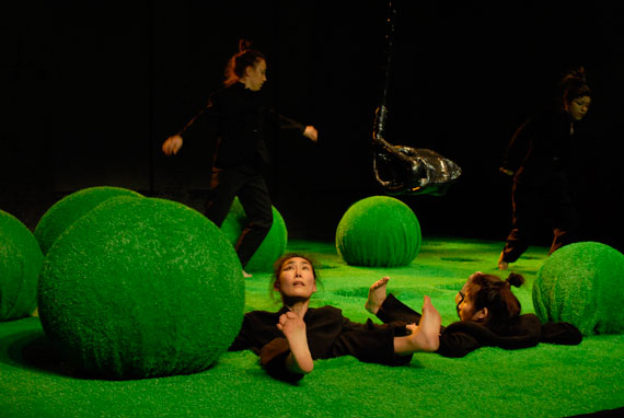 Zum internationalen Darstellerteam um Seki stieß bald auch die Landsmännin Yumiko Yoshioka, die, darf man den Quellen glauben, bereits 1978 an der ersten europäischen Butoh-Performance in Paris teilgenommen hatte. Als sich tatoeba auflöste, ließ sie das Fähnlein des Butoh weiterflattern und rief 1995 gemeinsam mit dem Bildhauer und Designer Joachim Manger das Ten Pen Chii art labor ins Leben. Seinen Sitz hat die Nachfolgeeinrichtung von tatoeba auf Schloss Bröllin, dem denkmalgeschützten Zentrum für Kunstforschung 120 Kilometer außerhalb der Hauptstadt. Dort forscht auch das Himmel-Änderung-Erde-Labor, wie man den Namen übersetzen könnte. Seinen Geburtstag begeht es derzeit im Dock 11 mit einem Defilee von vier Produktionen, zwei von ihnen sind Uraufführungen. Dem Thema Schönheitswahn sowie den ungeklärten Folgen straffender, aufspritzender, implantierender Eingriffe in den Körper ist „Bi-Ka“ (Die Verschönerung) auf der Spur. „Ket-Sui“ (Die Entscheidung) fragt nach dem Selbstlauf einmal getroffener Entscheidungen, nach dem Wechselspiel zwischen Treibenden und Getriebenen. Der Golfschläger steht dabei als Gerät, das durch Manipulation Prozesse in Gang setzt.