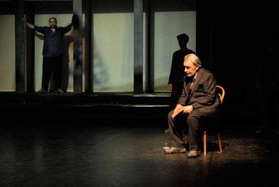 Zu Anfang zeigt ein Video, was türkische Frauen so über Männer denken. Von Macho bis kinderlieb seien sie, daheim weit weniger dominant als in der Öffentlichkeit. Nervös marschiert auf der Bühne unter der Leinwand ein alter Mann in den Kolonnaden eines Hauses auf und ab; hinter Gaze sieht man vier Gestalten. Mit gesenktem Kopf bilden sechs Spieler eine Reihe, gehen langsam auf die Zuschauer zu, hinein ins Leben. Versonnene Musik, live erzeugt von Nevzat Akpinar auf einer Baglama, der türkischen Langhalslaute, begleitet sie bei ihrem Zug mit Flugpose. Ein Junge tanzt wild, wird mehrfach von der Teig knetenden Mutter heimgerufen, bis sie ihn an den Ohren zieht: Du bleibst jetzt hier. Dort aber ist er Anwürfen, Kommandos und Beschuldigungen ausgesetzt, wird gehetzt, hält sich beim Streit der Eltern die Ohren zu. Hör auf zu weinen, alle sehen uns zu, herrscht ihn der Vater an. Percussion, Baglama und Teigschlagen geben den Rhythmus für ein Solo, das auch Folkloreschritte einbezieht und in der Körperverknotung endet. Das gesprochene Wort wird dann konkret.