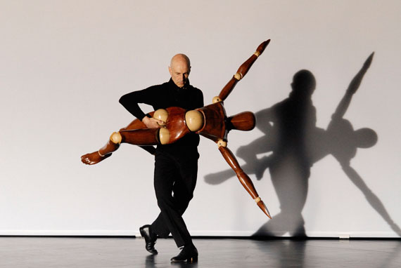 Handflächen klappen und drehen, Finger zeigen, wohin immer. Als erstes Requisit holt der Tänzer eine dreistufig schwarze Treppe zu sich, zeichnet erst, Übergang vom Linienhaften zum Runden, Halbkreise an die Wände, nähert sich der Treppe vorsichtig wie einem Partner, umarmt sie, lenkt sie aus, legt sich auf jede Stufe, stützt sich auf das Möbel, erteilt wie am Katheder eine Lektion in Hand, auf Fläche und/oder Rücken weisend. Endpunkt des Erprobens: der Aufstieg, sieghaft steht er in klassischer Position, ehe er über den Boden rollt, den Schwung des Gehens zitierend, aus dem Nackenstand abläuft. Im kompakten zweiten Teil, dann zu drängender Musik von Glenn Branca, probiert er, was er an sich entdeckt hat, mit einer braun hölzernen Gliederpuppe aus. Dass deren viele Kugelgelenke ein Mehr an Möglichkeiten hergeben, erinnert an Kleists Schrift „Über das Marionettentheater“ und den neidvollen Blick des Menschen auf die Marionette. Gelabert buchstabiert sein Vokabular an ihr durch, stemmt sie in der Drehung, lässt sie schweben, legt sie flach ab, kniet sich daneben auf eine braune Kugel: Unsicher wie diese Balance ist wohl auch alle Recherche. Mit „Schwarz weiß zeigen“ endet die Akademie der Künste ihre verdienstvolle Reihe „Politische Körper“. Der Rückblick auf Tänzer und ihr Wirken ist zugleich Ausblick auf eine Fortsetzung.