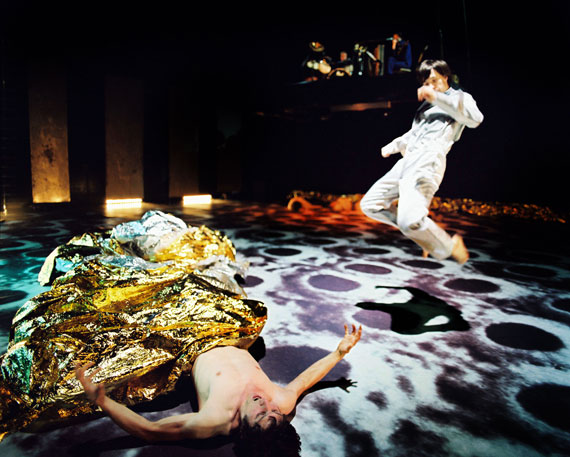 Der Auftakt des Abends scheint den Höllenfantasien eines Hieronymus Bosch entsprungen: Sieben nackte verkrümmte Körper wühlen sich im Halbdunkel durch Schichten goldener Lebensrettungsfolie. Überlebende einer Katastrophe? Neugeborene Gladiatoren in einer feindlichen Welt? Metallisches Hämmern ertönt, panisches Atmen und Schreie werden laut. Drei Männer in blauen Anzügen packen die zuckenden Gestalten erbarmungslos, leuchten ihnen mit Neoröhren in die Augen und unterwerfen sie mysteriösen Untersuchungen. Bereits mit diesem Anfangsbild