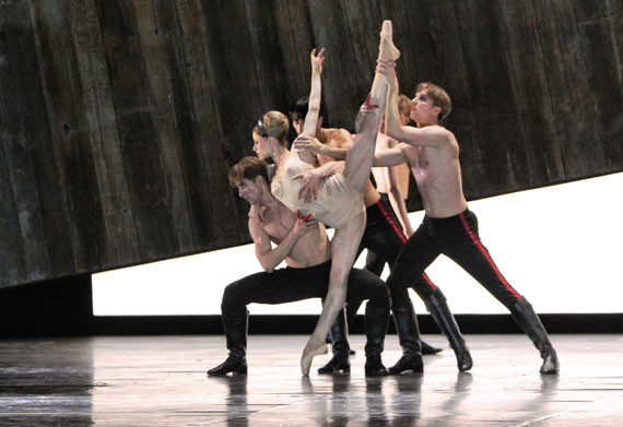 Ihnen allen baut das Design-Team NUMEN als überzeugendste Leistung des Abends eine imposante Bühne: Ein anfangs oben schwebendes Quadrat aus Licht fährt sich zu Hintergrundgröße aus; senkbare und vertikal fahrbare Kulissen in streifiger Düsternis bilden ein flirrendes Gewirr rechtwinkliger Räume wie Rahmen für die einzelnen tänzerischen Bilder, verschieben sich späterhin zu Bretterverschlag, Gittergeflecht, Kreuz.