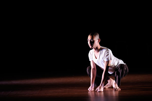 Lange hockt Er Gao im Zentrum der Szene, bevor er nach hinten tänzelt, mit plastischem Körper und geschmeidigen Armen. Dabei spricht er Marc Rees‘ Text, der auch sein eigener sein könnte. Ich bin unschuldig, rein, naiv, harmlos, so gibt er gleichsam ein Bild von sich selbst. Weit später in Jutta Hells und Dieter Baumanns Uraufführung „milk & bread/rice & water“ wird Li Ling Xi den Text nochmals sprechen. Dazu treibt sie die fünf anderen Tänzer wie mit der Wortpeitsche als Pulk vor sich her; den Inhalten scheint sie nicht zu glauben, schreit wie zur Selbstüberzeugung das „harmlos“ wieder und wieder. Gleich nach Gaos Solo hatte Xi vom Herzen in ihrem Brustkorb gesprochen und wie bei Wellen des Körpers die Organe einander berühren. Fühlt ihr das auch, hatte Ute Pliestermann die Fragen aus dem Chinesischen gedolmetscht. Natürlich fühlten wir das nicht, macht aber auch nix. Und der europäisch-chinesische Diskurs geht weiter. Im Atmen, Kippen, Anfassen, Schütteln äußert sich bei beiden Nationalitäten das Leben. Beinmuskeln, Hautfalten, Haarlängen werden verglichen, auch die Passfähigkeit der Fußsohlen und der Po-raus-Faktor.