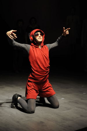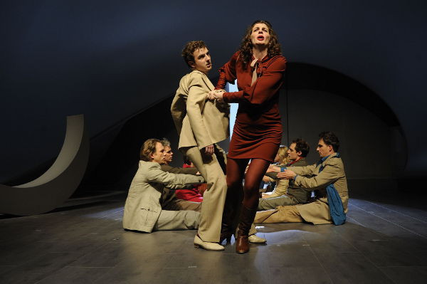 Jener Abstand des Komponisten zum eigenen OEuvre kommt Nico und Co. entgegen. Zwar hält sich die Regie konsequent an jene erste Fassung, addiert jedoch einen Countertenor, eine Tänzerin sowie Schauspieler, die aussprechen, was der Musik latent innewohnt, mehr noch Zuhörer von heute bewegt. So entsteht eine das Werk überwölbende Gesamtkonstruktion voller Fragen, Verunsicherungen und Zweifel. Einen in sich verdrehten weißen Bogen wölbt auch Proske über die Szene im Radialsystem, dem er eine raffiniert nutzbare Treppe unterschiebt. Zuspitzung bereits am Anfang. Da redet ein Mann im hellen Anzug auf einen barfüßigen Büßer mit Kapuze ein, will wissen, was hinter der Tür sei und ob sie sich öffne. Wer Antworten will, muss erst zuhören, entgegnet knapp die Kapuze. Die Flügel fahren auf, Passanten kommen, packen den Hellen, das Kyrie setzt ein, und auch eine Tänzerin in Rot, der Teufel möglicherweise, mischt sich unter. Die lauscht eigener Musik, wem sie die Kopfhörer leiht, gerät in Verzückung. Der erste Bruch. Lauter Gläubige auf einem Kissen, da sitzt der Teufel dazwischen, lacht einer den hehren Spuk weg und zermalmt gespendete Blumen.