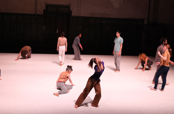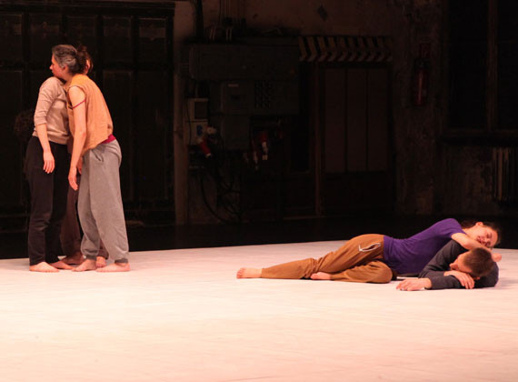 Aus den unterschiedlichen Raumkonstellationen der Körper, teils mit gleicher Armhaltbewegung, alles noch in der Stille, formt sich beinah unvermerkt Tanz, der alle erfasst und einem inneren Rhythmus folgt. Gut anzusehen ist jenes Fluten der Leiber, das in der Zusammenschau an eine tänzerische „Melodie“ erinnert. Als Chormusik von Bach einsetzt, verlassen alle wie auf der Flucht die Szene, nähern sich nur in kleinen Gruppen dem Klang, finden zurück zu ihrer flutenden Bewegung. Was erstaunt: Weder zum Text noch zur Musik sucht der Tanz eine nähere Beziehung. Jeder bleibt in seinem individuellen Material und geht langsam zu Boden, bis eine Art starrer Skulpturenpark entsteht. Als Bach leises Summen nachfolgt, verlagern sich die Plastiken in eine Diagonalfläche, schmiegen sich zu Gruppen, als ginge es um Beistand oder gemeinsame Trauer. Immer wieder flackert daraus Tanz auf, fast stets solistisch und ohne Bezug zu anderen. Wenn Kontakte stattfinden, in Umarmungen oder Bodenlagen, sind sie voller Zärtlichkeit.