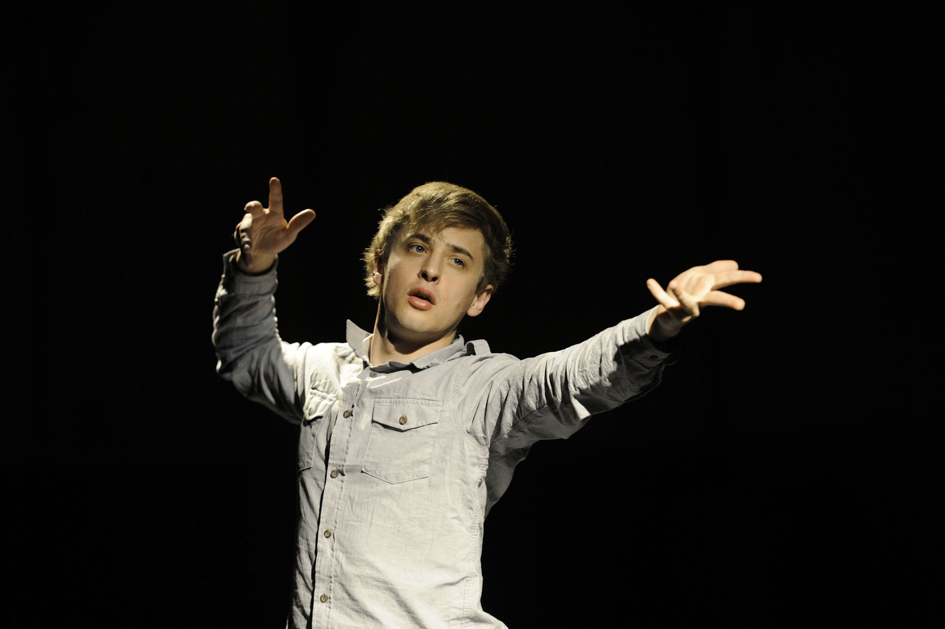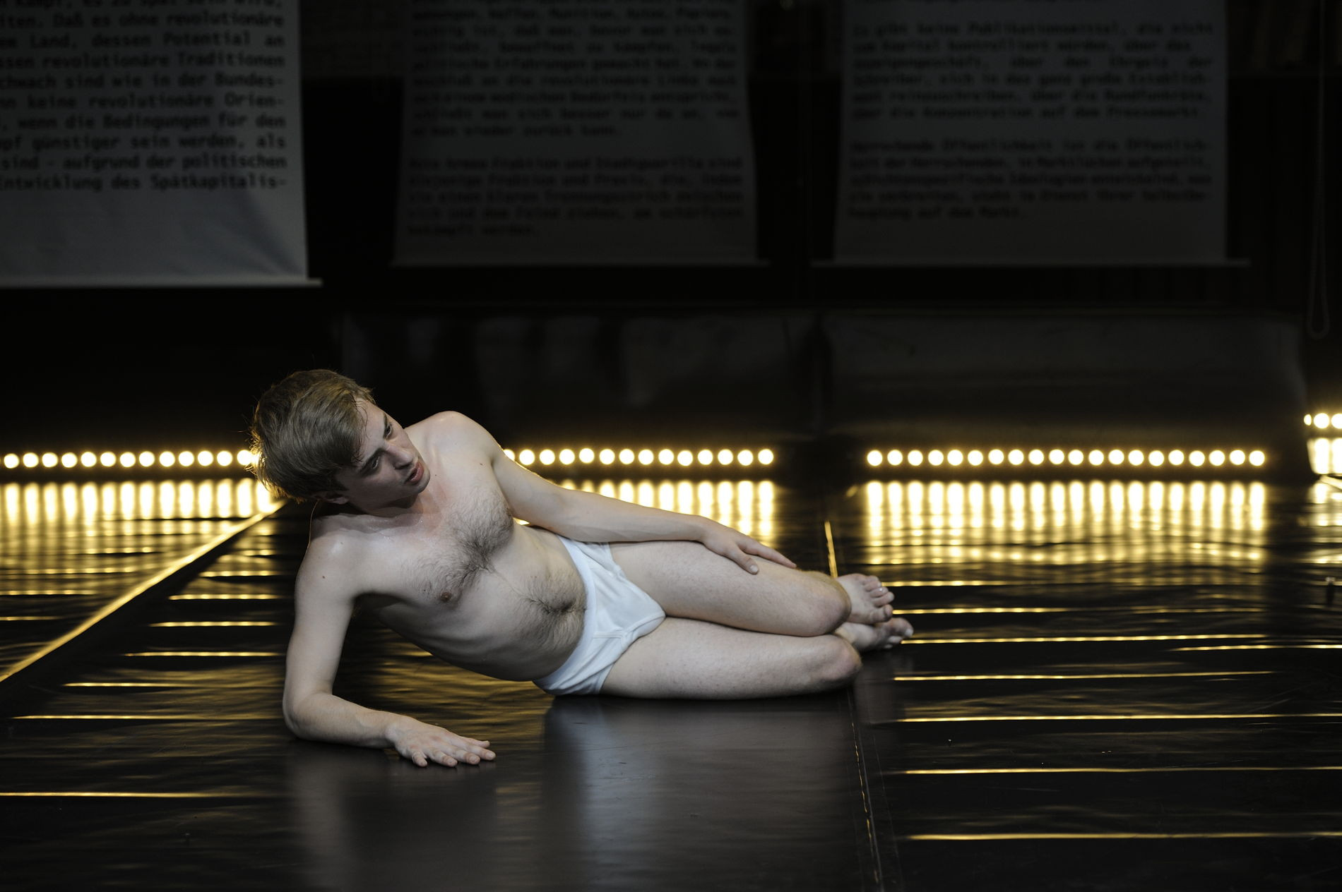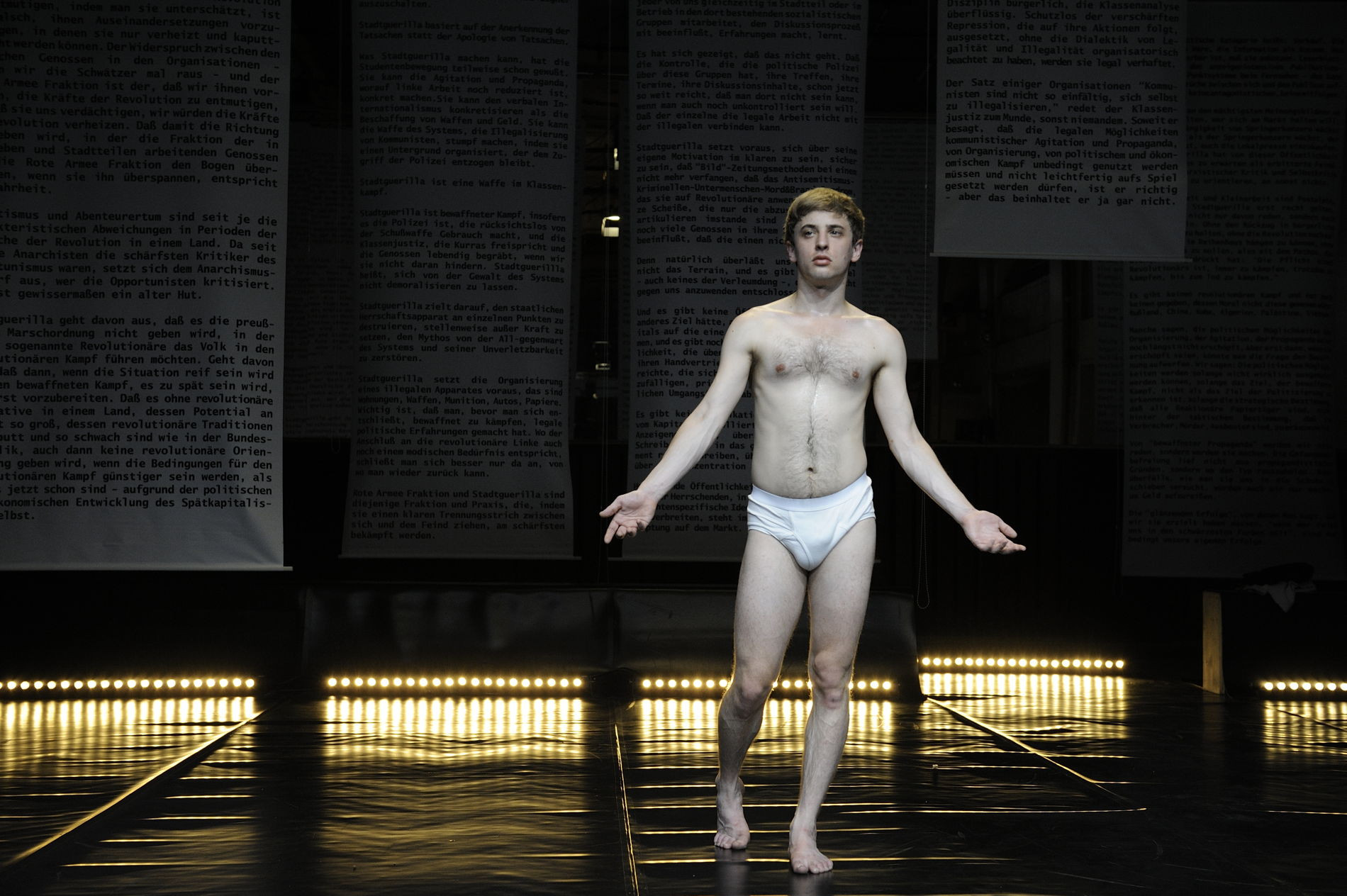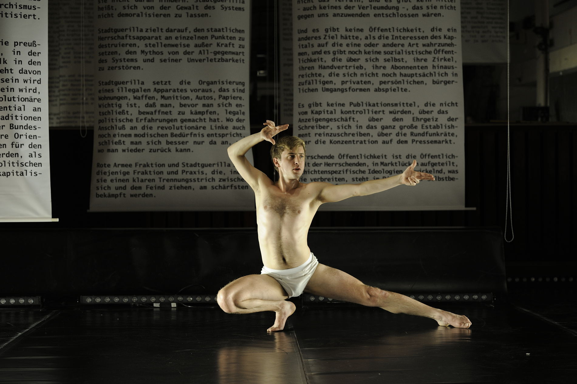 Noch während die Bildfolge auf zwei Monitoren abrollt, Baader als Baby, Schüler, Teenie zeigt, als Elegant unterm Strohhut, Narziss auch, dann im Polizei- und Fahndungsfoto, gezeichnet schließlich durch die Haft, setzt Martin Hansen im Spot mit wippendem Tanz ein. Größer werden die Körperwellen, der Torso weitet und dehnt sich puppenhaft mechanisch, die Arme öffnen sich, als würden sie in Schönheit eine MP halten. „Bild“ geifert dazu im Video Schlagzeilen heraus; im Blut liegt der Tote, ehe mit dem Begräbnis der Film endet. Dann ist nur noch Tanz, wild und wie gefangen im Wahn. Zwischendrin stellt sich der Tänzer eitel aus, wie Baader für Schwulenmagazine gemodelt hat, blickt provokant und verführerisch in den Saal. Alle seine Mittel und Vorzüge, so liest man, habe Baader einzusetzen gewusst, Taumler und Träumer ist er, ein Überzeuger, einer irgendwo zwischen politischen Ambitionen und persönlichen Obsessionen, eine von Hass zerfressene Politmarionette. Auch Winkler skizziert ihn derart, entwirft ein faszinierendes Psychogramm, mit dem er an seine großen Erfolge der Anfangsära anknüpft.