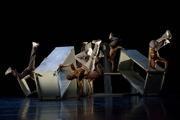 Lange passiert nichts. Auf der Szene Kästen hochkant im Dunkel, dazu Herzpochen vom Band. Die Kästen wandern, drehen, werden Türstöcke, durch die man fremde Welten erobert: das Leben. Das tun sechs Männer, kippen die Requisiten, ringen in Duos nach Balance. „In Vivo“, im Leben, haben sie sich zu behaupten, treten durch die Rahmen immer neu ein, treffen in Ansprüngen, Würfen, Fangposen aufeinander, formieren sich gefasst, gehoben zur Plastik. Stets bleiben sie in Kontakt, auch als sie die Kästen zum begehbaren Gebilde stapeln, fügen, anschrägen. Aus Begegnung, Provokation, Drohgebärde werden Duette mit rasant geflogenen Umhebungen, flüssig, geschmeidig, sicher. Verhalten entwickelt sich die Sinnsuche, entlädt sich in virtuosen Sturz-Dreh-Kaskaden, ohne dass artistischer Selbstzweck triumphiert. Man beobachtet einander bis zum Moment des Eingreifens. Dafür ergibt sich im originellen Gruppenstück reichlich Gelegenheit. Unspektakulär endet es in einem Standbild an der Rampe. Was an Mickael Le Mers Choreografie beeindruckt: Sie unterläuft Erwartungen an HipHop als zirzensischen Exzess, unterordnet jenen Tanzstil der Jugend unvordergründig einer Idee; sie setzt eben nicht Teenies ein, sondern muskelbewehrte, weltläufige Dreißiger; sie liefert eine sensible Mixtur aus Akrobatik, HipHop, Tanz und, auf der zeitgenössischen Bühne selten genug, im bewussten Umgang mit Julien Camarenas leiser Musik. Typen versammelt diese 2001 gegründete Gruppe aus La Roche-sur-Yon, ihr Name S’poart vom französischen Wort für Hoffnung scheint Programm einer neuen, humanen Art des Miteinanders.
