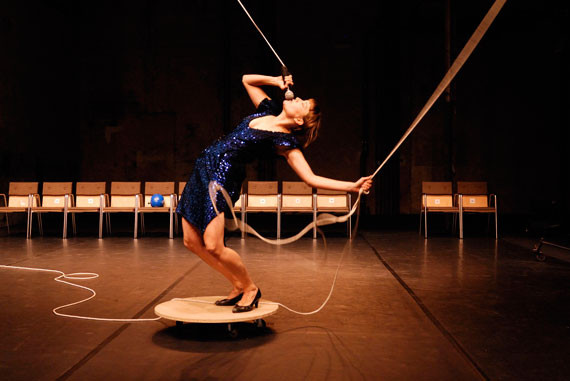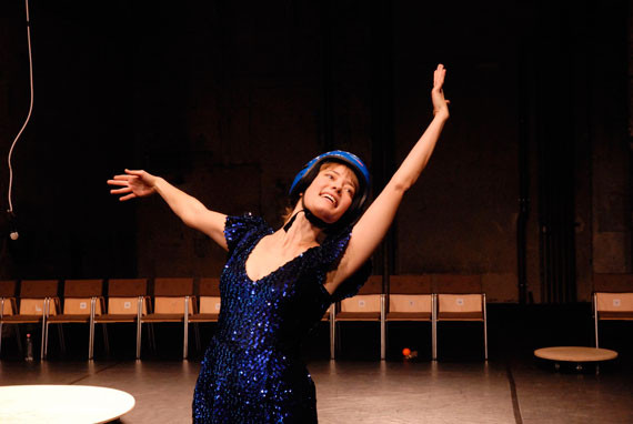 Vor großem Auditorium durfte sich Eva Burghardt präsentieren. Wie fast alle Abende der Tanztage war auch ihr Solo „Shut up and love me“ im Hochzeitssaal ausverkauft. Und fing gut an. Als Zuschauer blickt man auf eine leere, von unten bestrahlte und deshalb scheinbar schwebende Stuhlreihe, ahnt, es würde um Theater auf dem Theater gehen. Über einem fahrbaren Rundpodest als Zentrum hängt ein Mikrofon. In blauem Glitzerkleid betritt die Tänzerin, Studium in Salzburg und New York, ansässig jetzt in Berlin, den Raum, stürzt, bleibt lange liegen. Schaurigschön tönt dazu vom Band ein Uralt-Country-Song. Im zweiten Anlauf, mit Sturzhelm, schafft Burghardt auf kleinem runden Rollbrett den Weg zur Mitte, begrüßt das Publikum, will wie Orfanidou mehr Licht und redet: Wie sehr sie sich nun freue und dass in der Zeit der Vorstellung sicher irgendwo ein Kind geboren und ein Mensch sterben werde. Immer wieder zitiert sie eine Armführung des klassischen Tanzes, kippt hintüber ab, weiß vom Schmerz in den Schulterblättern zu berichten und von einer Frau im Supermarkt, die in einer Blutlache liege. Auch hier kommt nichts zur Auflösung. Burghardt erhebt das aber zum Prinzip: Sie sei am Anfang immer am Besten, finde die Mitte sinnlos und baut so ihre Performance. Wieder und wieder tritt sie durch einen Rahmen mit Silberstreifen, um fortsetzen zu können, was ins Stocken gerät. Das ist eine Weile ulkig, wird Gameshow, jedoch unverbindlich und ohne Schärfe, und versackt unrettbar in Selbstläufigkeit, von fortwährender Umbau- und Fahraktion der Requisiten bis zum Essen aus dem Helm. Sie legt die alte Platte mit dem Country-Song auf, lauscht, will gehen, die Tür aber ist verschlossen. So findet die Performance doch noch ein Ende. 50 Minuten sind nicht die Welt, sagt Burghardt anfangs. Für sie, der man gern zusieht, war diese Welt dennoch Nummern zu groß. Weitere Gastspiele folgen.
