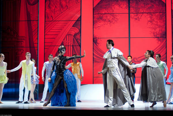 Dramatische Klänge in furiosem Tempo aus dem Orchestergraben stimmen ein auf ein Szenario zwischen finsterem Terror und heiterem Rokoko. Im Prolog tanzen auf der düsteren Vorderbühne die böse Königin Carabosse (Marcelo Moraes), ihr devoter Gemahl (Matthew Williams) und beider Sohn, Prinz Desiré (Huy Tien Tran). Hinten erstrahlt die heile Welt der Hellen Königsfamilie (Königin Hayley Macri, König Leszek Januszewski und Prinzessin Aurora Yoko Furihata). Prinzen, Hofdamen und „Kreaturen“ samt einem zauberhaften blauen Vogel (André Baeta) sind Mitstreiter im Kampf zwischen Böse und Gut. Ein