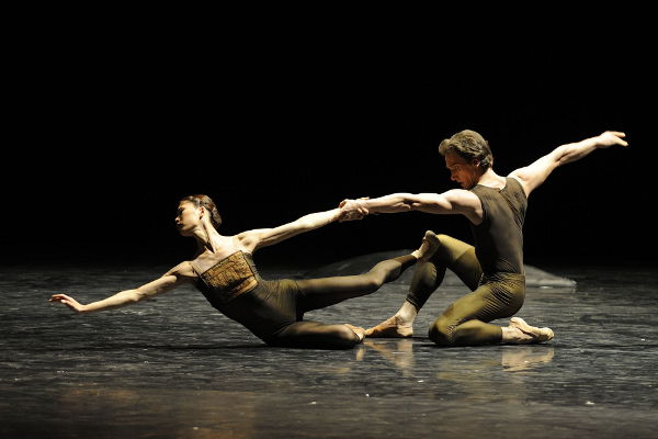 Von acht überwiegend langsamen Sätzen aus Arcangelo Corellis Concerti grossi op. 6 ließ sich Nacho Duato 2000 zu „Arcangelo“ anregen. Um Liebe, Verzückung, spirituelle Erfahrung, letztlich den Übergang ins Jenseits geht es dem Spanier zum Wohlton des barocken Italieners. Die oberen Drittel der Rückwand bleiben Brandmauer, das untere, aus dem die Tänzer auftreten, in das sie entschwinden, ist schwarz. Vier Paare verlieren sich an eine Abfolge einzelner Pas de deux mit den für Duato typischen skurrilen Hebeposen in körperengem, musikfühligem, fließfähigem Tanz der luziden Durchdringungen, originellen Paarfiguren und Umschlingungen. Mehrmals werden Partner über Lichthügeln im Boden abgelegt, als würden sie dort erleuchtet. Gegen Schluss liegen drei der Paare auf dem Boden, das vierte trennt ein herabgelassener schwarzer Schal, der schützende Hülle wird,an dem sie hängend in ein ungewisses Oben entschweben. Souverän musiziert Duato auf dem Instrument Körper und entlockt ihm eine ungewöhnliche, eher transzendente Emotionalität. Die Paare Nakamura/Kaniskin, Cabrera/Ghalumyan, Semionova/Banzhaf sowie Mestrovic/Jakovina folgen ihm dabei willig und gediegen.