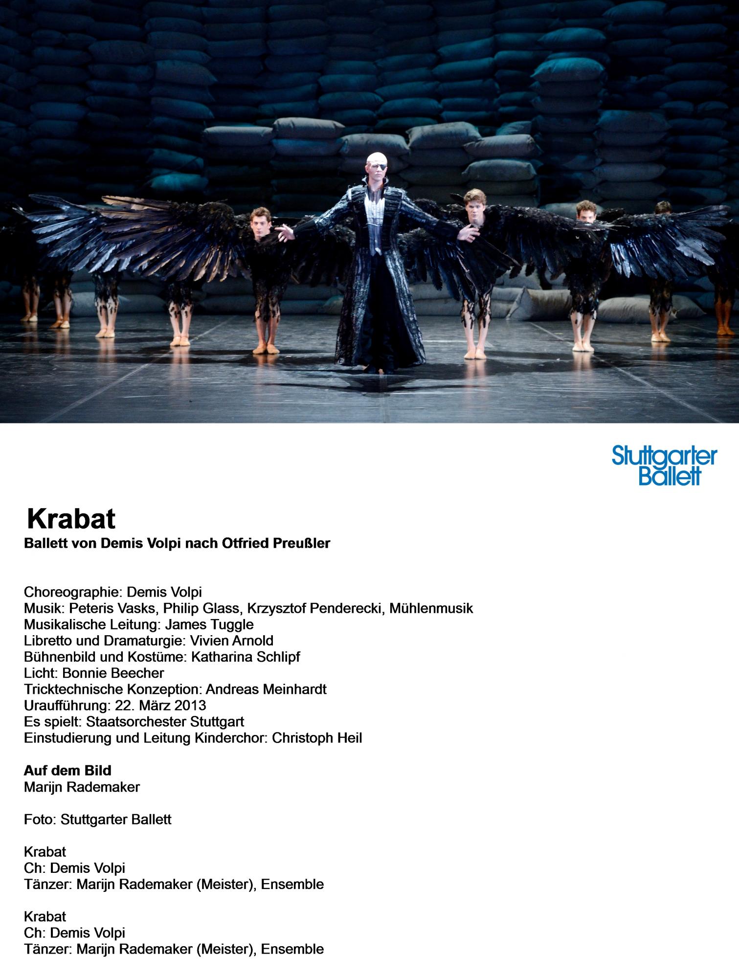 Volpi choreografiert „Krabat“, niedergeschrieben 1971, eine Parabel auf eine totalitäre Gesellschaft, die den Einzelnen gleichschaltet und menschenunwürdig behandelt; aber auch auf die Kraft der romantischen Liebe.