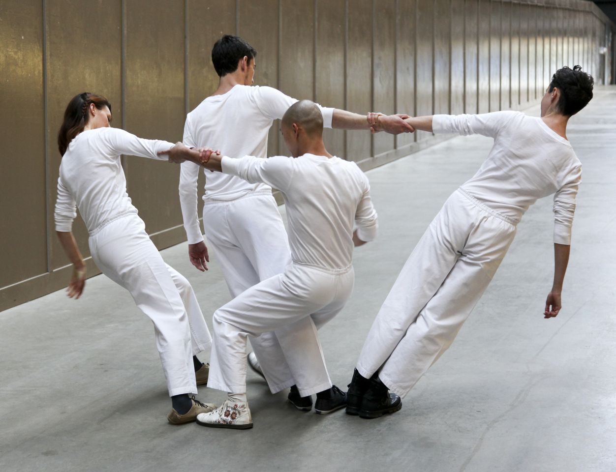 Unisex weiß gekleidet sind auch die Akteure. Sie legen sich in Reihe, ihre langen Holzstäbe bilden eine verbundene Linie, die sie trotz synchroner Bewegungen um diese Achse herum zu halten versuchen. Im Stand entspräche das einem Mehr-Mann-Hoch aus der Artistik. Mit Kommandos verständigen sie sich, dennoch reißt bisweilen die Stäbeverbindung: Scheitern einbegriffen. Dann gruppieren sich vier Tänzer um eine Säule, ihre Holzstäbe vom Kopf schräg bis auf den Boden. Gleichzeitig gehen sie aufs Knie und lagern den Stab auf dem rückwärts gebogenen anderen Fuß ab. Oder zwei Männer lassen ihre Holzschrägen vom Kopf aus auf dem Boden zusammenstoßen, vollführen die gleichen Beugeexerzitien – mit der Front, danach mit dem Rücken zueinander.