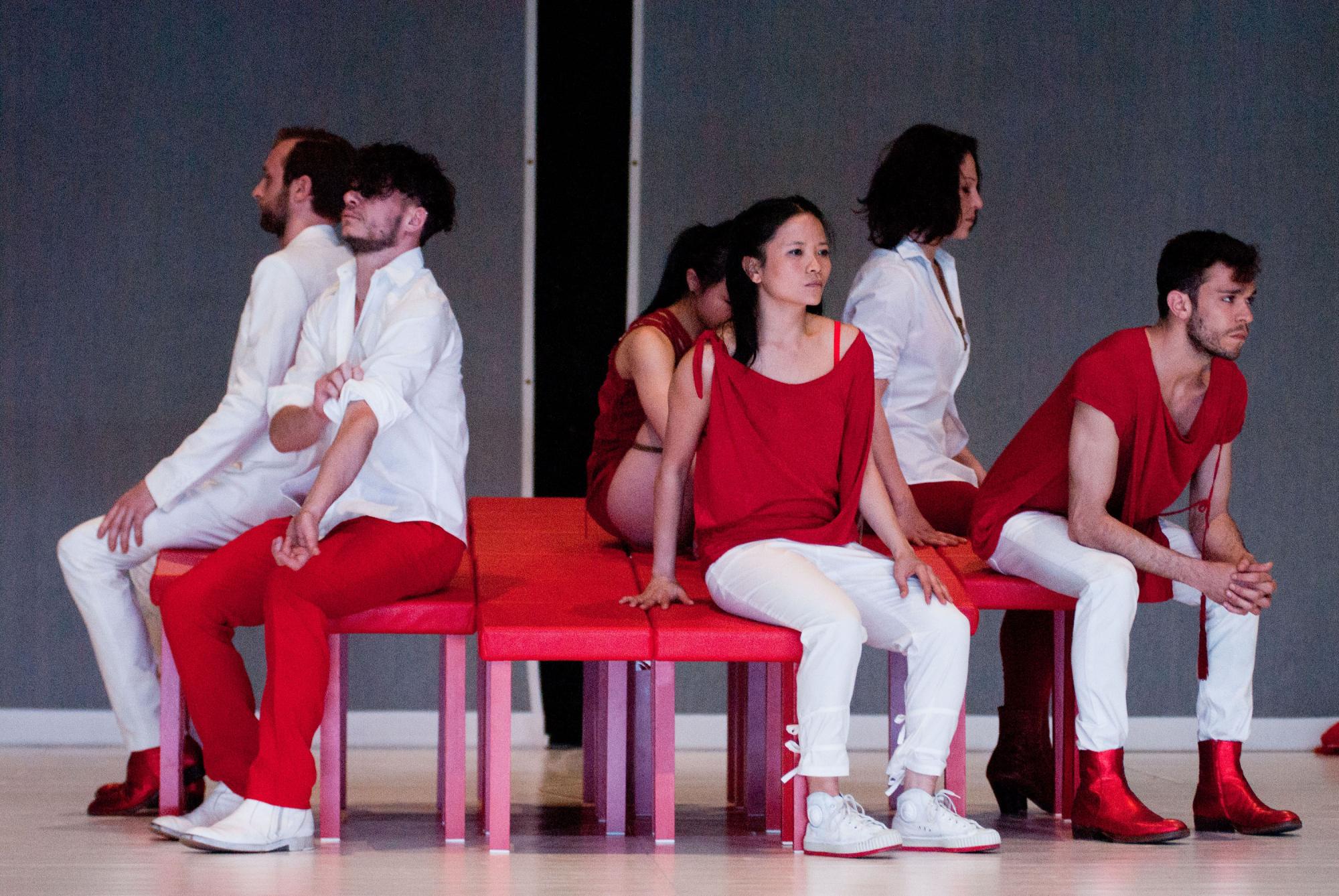 Langsam, aber kraftvoll treibt Ann van den Broeck in „Red Piece“ ihre zunächst mit Bondage-Seilen gefesselte Crew in die rhythmische Ekstase und an den Rand der Erschöpfung.