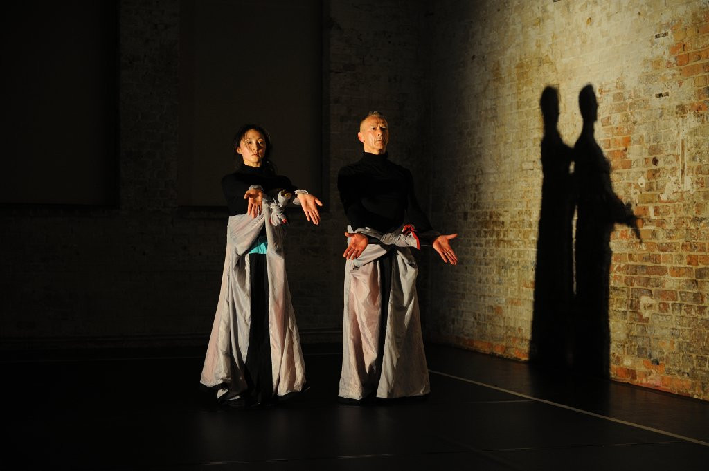 Für „Two Figures in a Landscape“ konnte Rubato als originellen Partner den jungen Briten Jonathan Baldock gewinnen, bildender Künstler und nun auch Kostümdesigner. Sein Beitrag trägt ganz wesentlich eine Tanzschöpfung, der Jutta Hell choreografische Gestalt verlieh. Schwarz gekleidet betreten Dieter Baumann und Li Ling Xi die leere Szene. Zwei Stoffrollen balancieren sie auf dem Kopf, fassen sich an den Händen, durchmessen in beinah zeremonieller Ruhe den Raum. Dann die Transformation: Zuerst bewerfen sie sich mit den Rollen, schütteln überraschend den Stoff zum bunten Gewand, zeigen es demonstrativ und streifen es sich über. Da werden sie zu tanzenden Kunstfiguren, belebte abstrakte Studien eines Piet Mondrian mit seinen gegeneinander gesetzten Farbflächen und gleichsam stilisierter Personnage der chinesischen Oper. In diesem unorthodoxen Spannungsfeld bewegt sich doppelten Sinns das gesamte Stück. Mit den extrem langen Ärmeln, auch dies ein Zitat asiatischen Theaters, wirken die zwei Akteure mitunter wie bunte Vögel, breiten die Arme aus, wollen fliegen, gehen zu Boden, geben eine Art von Winksignalen oder peitschen drehend im Stand die Luft. Das wiederum erinnert an die Trance türkischer Derwische.