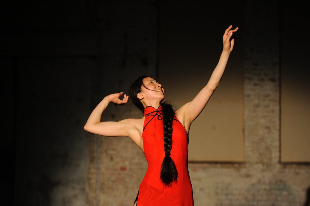 Radikaler geht Li Ling Xi in ihrem Solo zu Werke. Jutta Hell hat ihr „Happiness / Xing Fu“ auf den offenkundig suchenden Tänzerleib choreografiert. Im hochgeschlossenen, fackelartig lachsroten Langkleid mit Seitschlitzen und Rückendekolleté steht die in Folklore vorzüglich geschulte Tänzerin auf der Szene. Schwarze Stiefel erinnern an ihre Tanzausbildung bei der chinesischen Volksbefreiungsarmee in Peking. Doch wie sich die Gesellschaft des Landes mit allgemein westlicher Lebensart konfrontiert sieht, ist Li Ling Xi mit dem zeitgenössischen Tanz des Westens in Kontakt gekommen. Er provoziert und lockt sie offensichtlich zur Auseinandersetzung. Gern schaut man ihr zu, wie sich Volkstanz aus Tibet, der Mongolei und der Provinz Xin Jiang, wie das Programmheft aufklärt, zu hartem Beat in Poptanz auflöst, als Shanghai-Party mit Butoh-Elementen. Lang wirkt das, weniger belangvoll formuliert und ohne den Grad an Stilisierung, der die 50 Minuten der „Zwei Figuren in einer Landschaft“ zusammenhält. Dem Charme der famosen Interpretin jenes halb so langen „Glücks“ erliegt man indes allemal.
