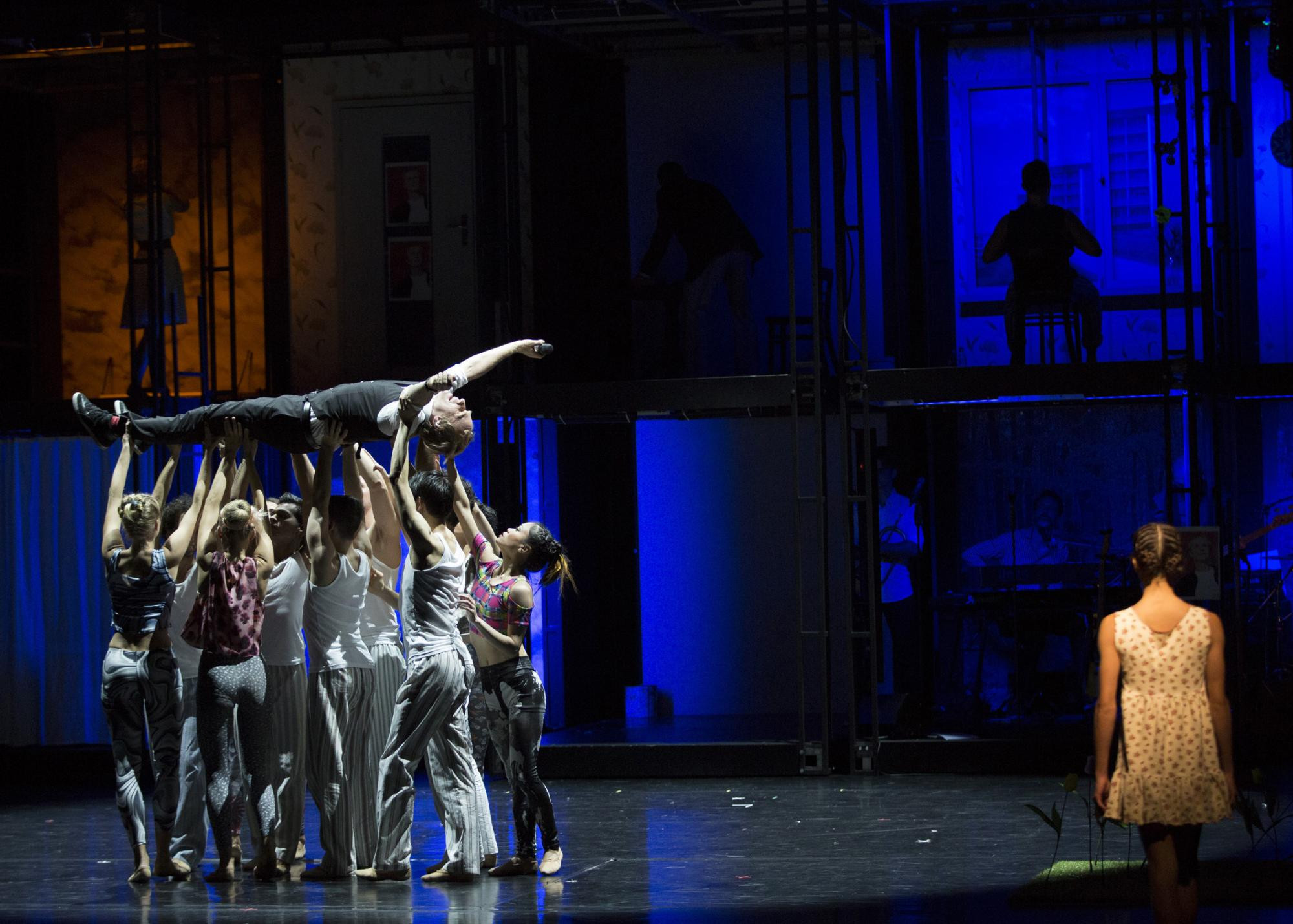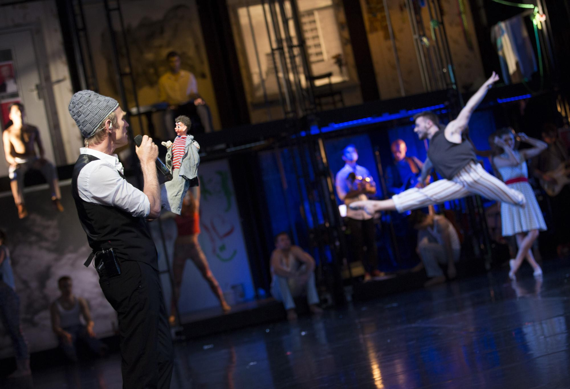 Das ereignet sich auf Andreas Auerbachs Bühne in den Zimmern der drei Etagen eines Plattenbaus. Unten rechts hat die Band ihren Sitz; um Sänger Norbert als Stichwortgeber in der Mitte der Szene toben sich die Emotionen der Bewohner aus. Tief ins Orchester führt eine Schräge, über die die jungen Leute nackt bis auf Slips erscheinen und zum Schluss wieder entschwinden. Nur der Grenzgänger, Norberts tänzerisches Alter Ego, und die unerreichbare Traumfrau bleiben in gebührendem Abstand zurück. Wohl tragen auch andere Figuren Namen, Der Er-Trinkende, Der Anti-Pazifist, Das Kleinod, Der Einsame, Der Gezeichnete, Die Sich-Einstrickende, wie sie aus den Songtexten resultieren. Dass Silvana Schröder sie jedoch nur als Trampolin nutzt, um ins Eigene, Assoziative zu gelangen, verleiht dem Tanz seine Souveränität gegen die Übermacht der Textpoesie. So ist es das „Blut der ersten Sonnenstrahlen“, das die Menschenscharen ins Leben führt und sich wie „Schmetterlinge“ bunt verkleiden lässt. Dann rollt es ab, das große Panoptikum des Alltags, vom Rückzug ins Tulpenfeld oder den Alkohol über den Partnertest bis zum vermeintlichen Glück, das in einem tödlichen Projektil liegt.
