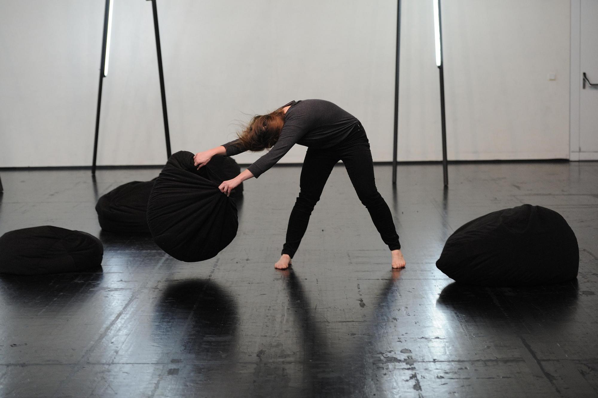 Aus Isabelle Schads Beschäftigung mit Franz Kafkas Erzählung „Der Bau“ sind seit 2013 ein Solo mit gleichnamigem Titel sowie „Der Bau – Gruppe 12x60“, ein Stück für 12 TänzerInnen und sechzig Sitzsäcke hervorgegangen. Ergänzend dazu steht die Arbeit „Form und Masse“. Deren Neufassung, die vergangene Woche an den Berliner Uferstudios zu sehen war, ist eine Art energetische Installation. Mit somatischen Methoden wie Body-Mind-Centering und fernöstlich geprägten Konzepten von Körperenergien verleiht Schad organischen Bewegungsabläufen eine