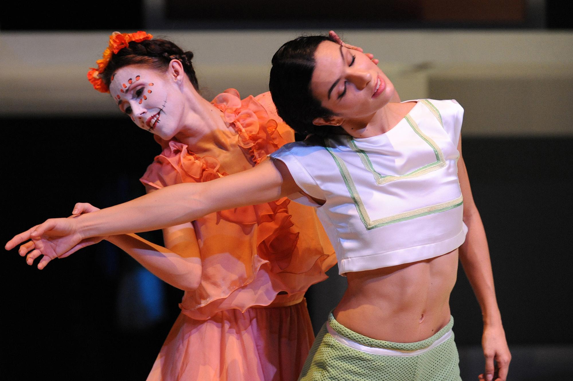 In sieben Teile gliedert die Choreografin ihre neunzigminütige Uraufführung und gibt ihnen Überschriften, die sich auf den Farbkanon nach Kahlos Deutung beziehen. Heike Mondschein hat dafür ein Gerüst aus zwei Etagen entworfen, das jenes Haus in Mexiko-Stadt zitieren mag. Obenauf liegt eine armlose nackte Puppe mit amputiertem Bein, Kahlos Leidensweg vorwegnehmend. Farbiges Licht rastert immer wieder die verschiebbaren Rahmen. Mit „Rot“ eröffnet Werchau den Reigen: Am Totentag, in Mexiko ein ausgelassenes Fest zur Ehre der Verstorbenen, spaziert der personifizierte, grell geschminkte Tod (Denise Ruddock) auf die Szene. Unter den Feiernden befindet sich auch Frida, krank schon, von der Gruppe getragen. Einzelne Bilder illustrieren Episoden ihrer Vita. Der Vater bandagiert das kindergelähmte Mädchen, das steifbeinig tanzt, sich eine Freundin erfindet. Was für die 18-Jährige zum traumatischen Lebensereignis wird, ein Busunfall, bei dem eine Stange ihren Unterleib durchbohrt, gestaltet Werchau als Scooter-ähnliche Fahrt auf Treppen, die kollidieren. Spitalaufenthalte, Operationen, Schmerzanfälle werden Fridas Alltag. Den lebt sie mit Diego Rivera, Mexikos populärstem Wandmaler, der sie liebt, ständig betrügt, selbst mit Fridas jüngerer Schwester, und dennoch bis zum Tod ihre wichtigste Stütze bleibt. Pralle Gefühle, so recht Thema des Tanzes.