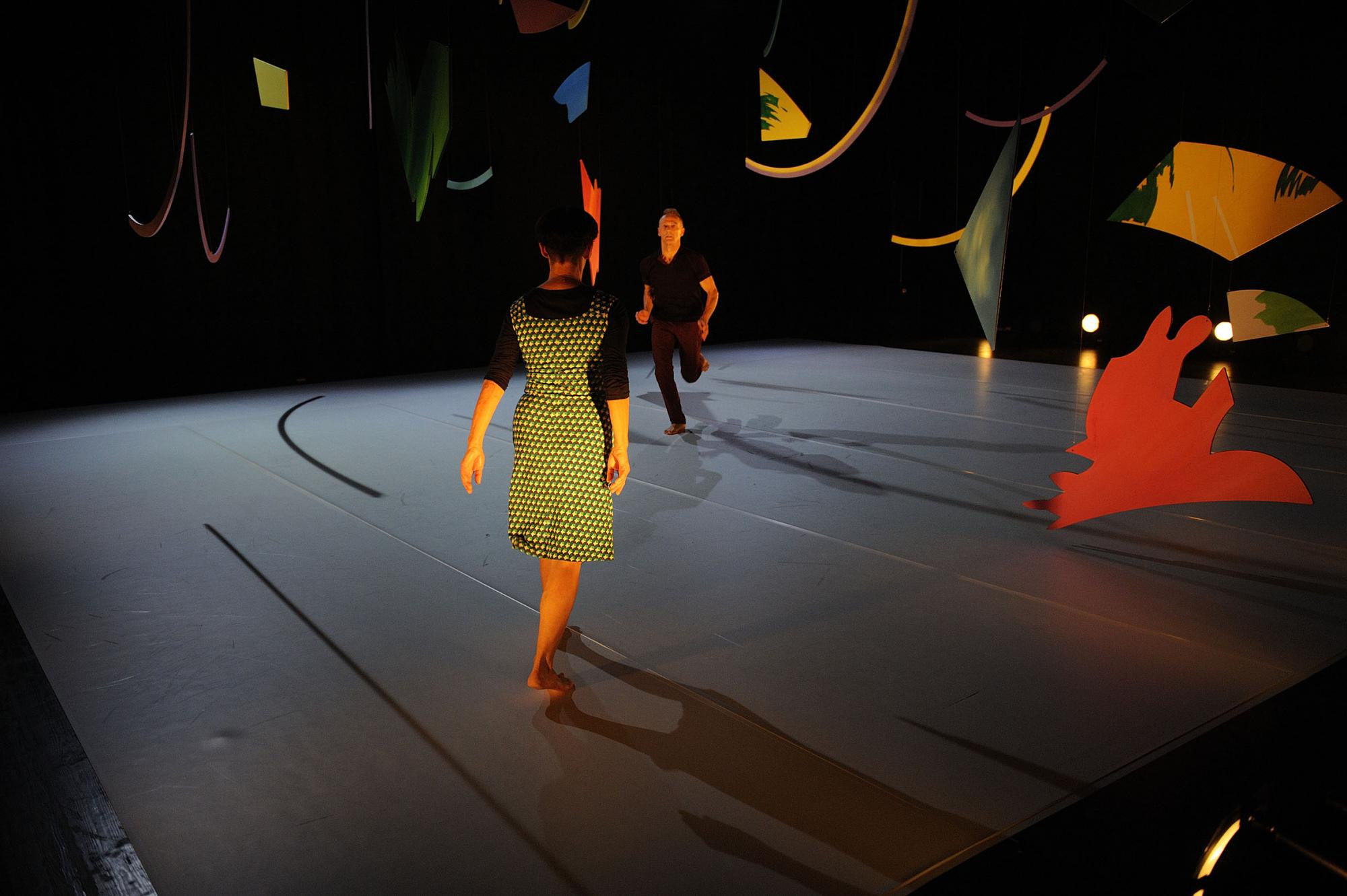 Wie bunte Splitter eines Lebens hängen all die geometrischen Mobiles, Bögen, Trapeze, Segmente, Winkel, über der Bühne im Nachbarraum. Die chinesische Künstlerin Bi Rongrong scheint sie einem Gemälde ausgeschnitten zu haben. Von verschiedenen Seiten betreten Hell und Baumann in „American Finch“, dem Schlussduo, den wiederum hellen Boden. Wie zwei Vögel flattern sie, jeder erst für sich, unter den in Schwingung versetzten Schnipseln über die Diagonale. Jung und ausgelassen wirken sie, gelöst wie staunende Kinder in einem unbekannten Kosmos. Es scheint die Leichtigkeit des Alters zu sein, die Gewissheit auch ausgestandener, siegreich beendeter Kämpfe, die sie so ungezwungen, fast schlaksig die Hüften kreisen, liebevoll die Arme auflegen lässt. Besitzenwollen ist der Sicherheit einer gemeinsamen Zukunft gewichen. Nur einen Moment lang dirigiert jetzt sie ihn, ehe sie wieder zusammen durch Raum und Leben turteln, fröhlich einander austricksen und tanzend den Saal verlassen, im Aufbruch zu Neuem. Nicht ganz so stringent wie Teil zwei mag dieses Duett sein, hebt dessen Schwere jedoch angenehm ins Optimistische auf.