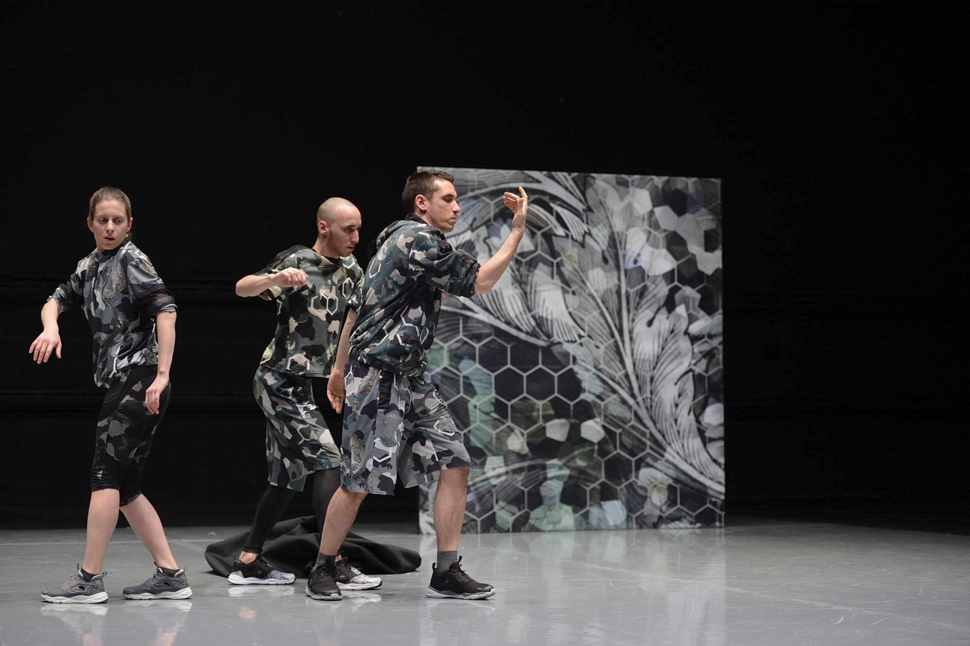 Manchmal auch pulsen die Körper synchron, pumpen mit geballten Fäusten ihre Arme, als wollten sie aus den Leibern gewaltsam etwas zutage fördern. „OILinity“ heißt, was die Griechin Kat Válastur mit sozialem Engagement choreografiert hat; und Öl scheint es auch, was den Raum ausfüllt und gebundene Bewegung unmöglich macht, Hände sich straff in den Magen bohren lässt. Ein Rätsel bleibt vorerst: In der Mitte, rechts und links am Rand liegen drei schwarz überdeckte Häufchen verschiedener Gestalt. Zu ihnen hin streben bisweilen die Tänzer, doch sind dies offenbar verbotene Zonen, von denen es sie mit fahrigen Attacken wieder fortreißt. Trancehaft drehen sie auf dem Po, nehmen Liegepositionen ein, wiederholen mechanisch ausgeführte Motive: Sie streichen sich übers Gesicht, als würden sie etwas nicht sehen wollen; führen im Liegen Bein und Arm gegensinnig und mit Widerstand. Direkte Kontakte gibt es dabei nicht, alle drei sind dennoch derselben angstvollen Situation ausgesetzt. Wie ein menschliches Räderwerk arbeitet das Trio Isolierter, irrt durch seinen hermetischen Kosmos und rudert aufsässig mit den Armen.