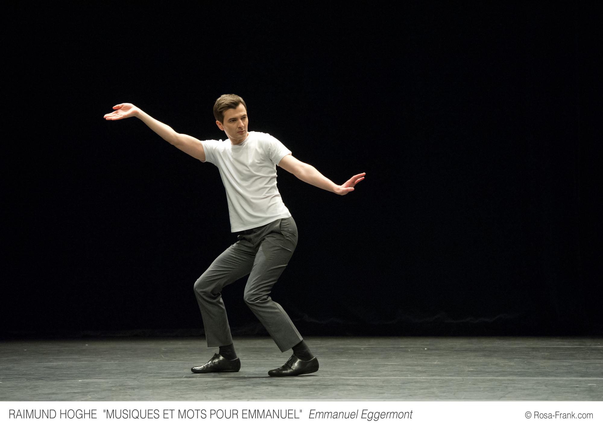 Dem Tänzer Emmanuel Eggermont widmet Raimund Hoghe zum zehnjährigen Jubiläum der Zusammenarbeit seine neue Choreografie. Was für ein Geschenk! Musiken und Worte für einen Tänzer, um dessen Körper umso beredter präsentieren zu können. Dabei: Eggermont verblüfft nicht einmal mit Serien von Grands jetés, perfekten Cabrioles, hoch gesprungenen Pas ciseaux oder Breakdance und sonst welcher halsbrecherischen Akrobatik. Er begnügt sich vielmehr mit minimalen Handzeichen wie dem Abknicken in den Gelenken, blitzschnellem Vibrieren der Finger wie Flügelschläge von Colibris, lang gehaltener Pose eines