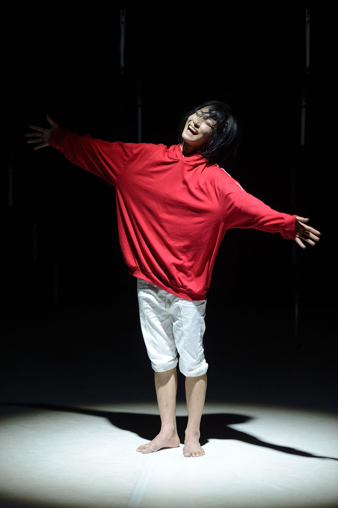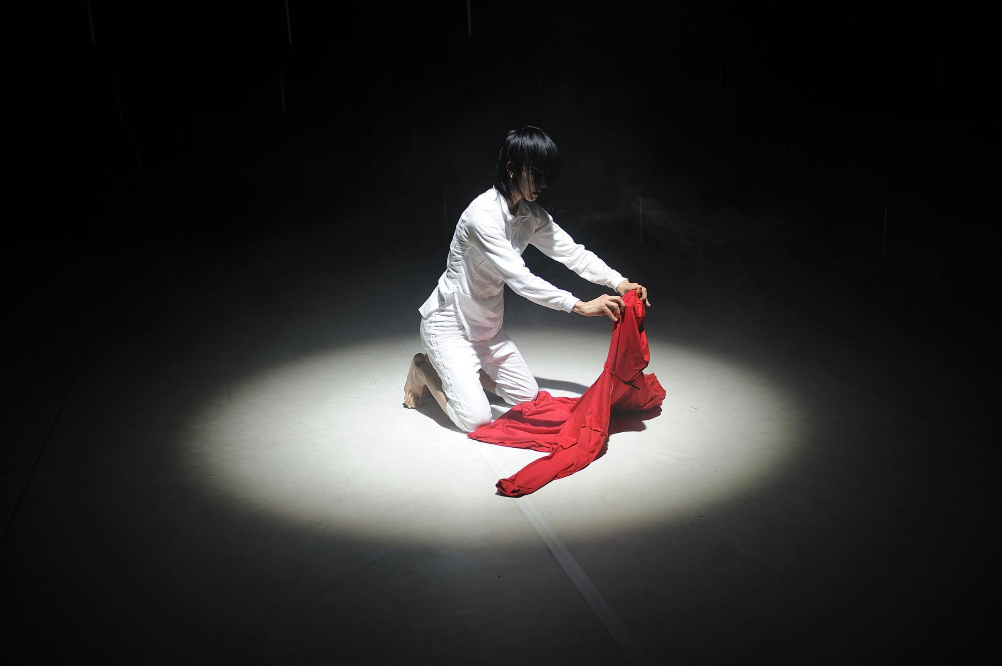 Offenkundig fühlt sie sich nicht unwohl in der ungewohnten Sphäre. Das ändert sich, als aus dem Plafond eine signalrote Joggingjacke fällt. Vom „Röslein rot“ singen in Popversion leise Kinderstimmen. Wann immer sich die Tänzerin dem Lichtkreis nähern und der Jacke bemächtigen will, plärrt der Song bedrohlich laut und schreckt sie zurück. Neugierig und ängstlich zugleich trippelt sie, zittert, springt schließlich beherzt auf das Kleidungsstück. Noch schmerzt es, wenn sie den Arm hineinsteckt. Als sie es überzieht, geschieht das verkehrt herum: Statt des Gesichts wuschelt ihr schwarzer Haarschopf aus der Kapuzenöffnung. Mit der richtigen Kleiderordnung eignet sie sich die fremde Haut an, wobei sich ihr Bewegungsduktus ändert. Was anfangs ganz unbefangen wirkte, unterliegt jetzt europäischen Ritualen. Als Marionette begrüßt sie unsichtbare Gäste, schüttelt soldatisch Hände, lächelt gezwungen, verbeugt sich geziert, verteilt in der Umarmung Küsschen rechts, links. Im Flackern des Lichts beschleunigt sich bei steter Wiederholung das Tempo bis zur sinnentleerten Mechanik. Stimmen verunsichern zusätzlich: Im Flackerraum ertönen japanische und deutsche Satzfetzen. „Weg“ hört man, „du stürzt“, „Stille“ oder „zu hell“. Das lässt die Figur zum Häufchen zusammensinken. Zu „scharfe Schatten führen ins Schwarz“ vollzieht sie einen ersten Akt der Befreiung aus dem Gefängnis des Lichtkreises: Sie setzt einen Leuchtstab in Schwingung, bricht damit die Starre der Raumkonstruktion auf. Da quillt Nebel aus dem Hintergrund, konturlos durchwandert die Tänzerin den Dunst, wird gar unsichtbar, scheint sich zu verflüssigen.