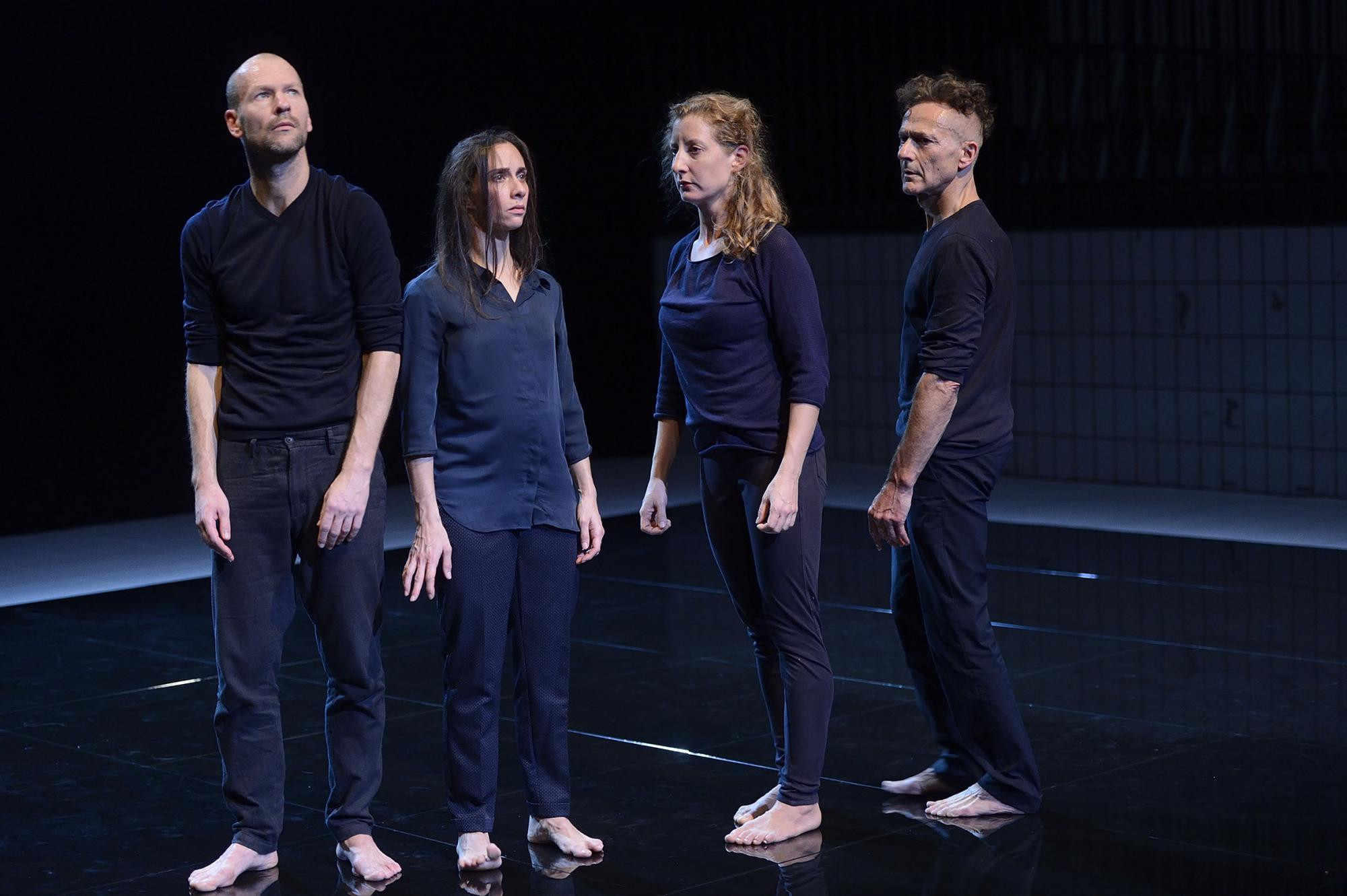 Sirenengeheul stachelt die Auflehnung an, rutschendes Gehen in Seitlage weist auf eine schräge, ihrer Form beraubte Welt hin. Nach einem Drehtaumel führen die Tänzer ihre Hände vors Gesicht, nicht zu plakativer Klage, sondern um zum Geräusch von Maschinen etwas zu zeigen, süffisant zu grinsen und sich dann gesenkten Hauptes zum gefassten Fries Kopfloser zu fügen. Spannungen zerreißen die Form, Hierarchien tun sich auf, wenn einer die anderen niederdrückt. Aus dem Kampf bilden sich in Schutzsuche oder zur Gegenwehr zwei verklammerte Paare. Immer wieder prallen dann die Partner aus dem Lauf zusammen, woraus ein wilder Wirbel entsteht, der Befreiung wie Wut der Verzweiflung bedeuten kann. Im Höhepunkt stoppt der Furor abrupt und überlässt es dem Zuschauer, ihn weiterzudenken. So spröde wie konsequent ist, was Jutta Hell ihren Interpreten Mercedes Appugliese, Anja Sielaff, Dieter Baumann, Carlos Osatinsky an Bedrohlichem über unsere Zeit in die willigen Körper gesenkt hat.