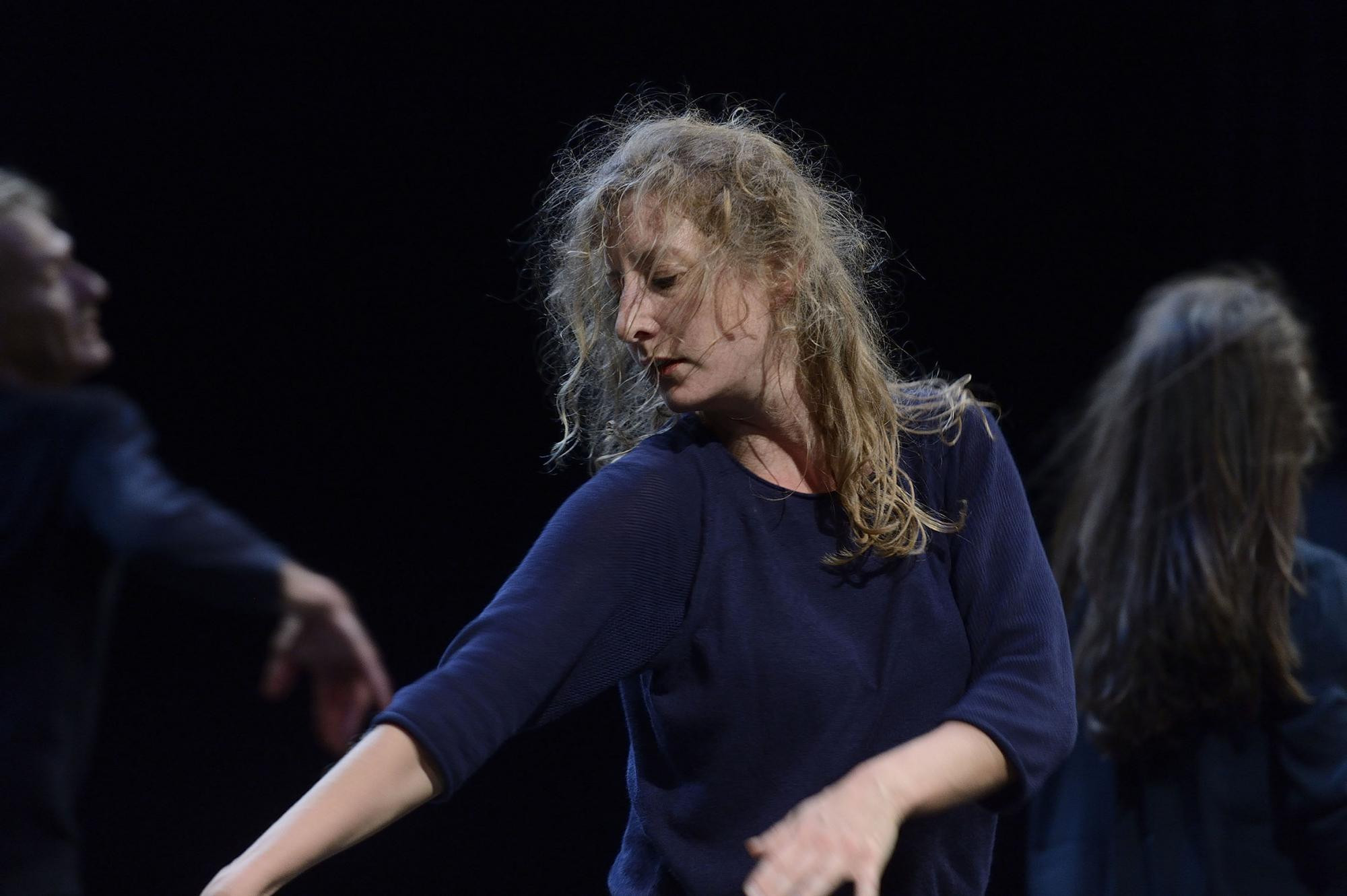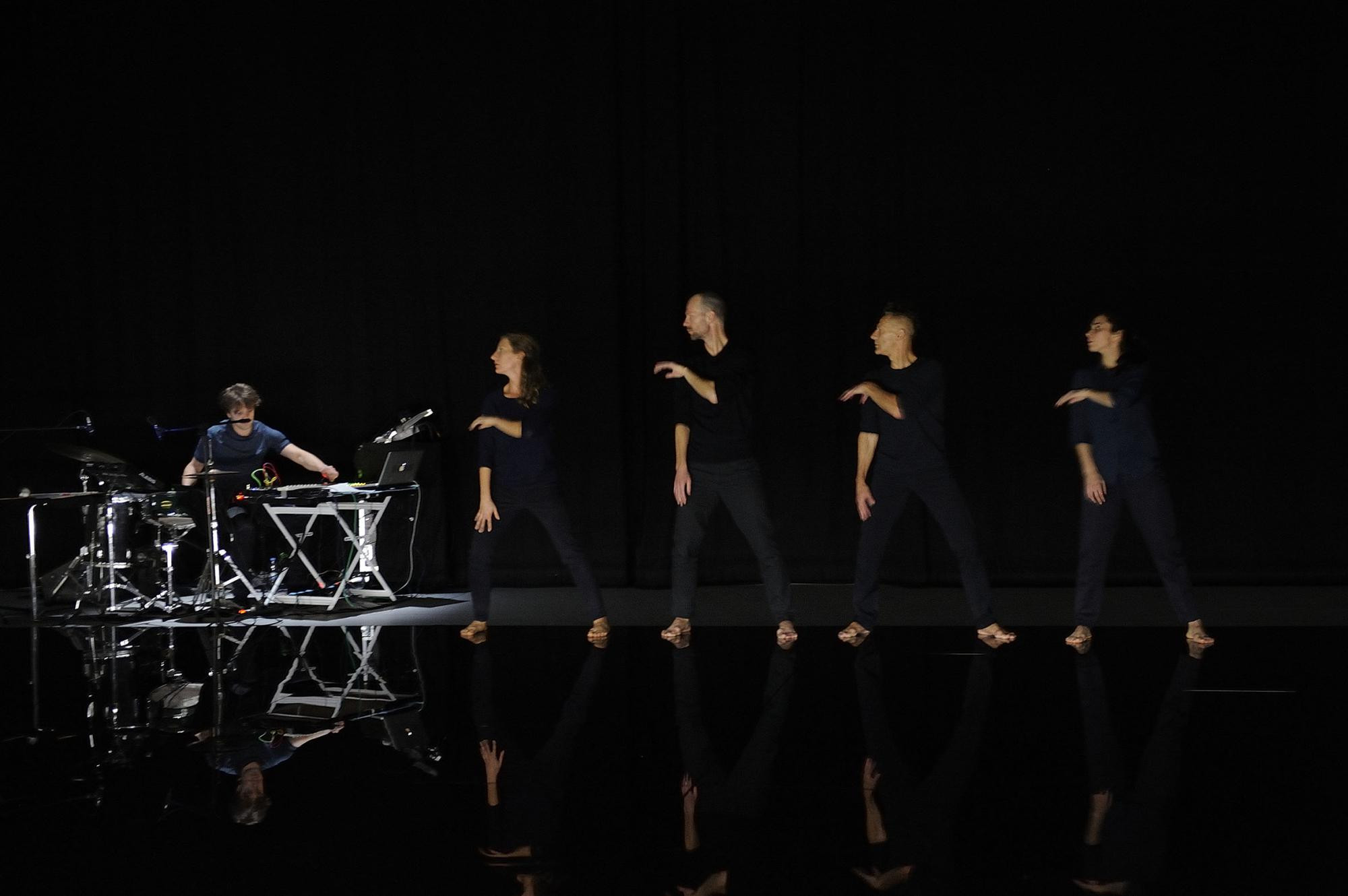 Aus dem Dunkel hört man Keuchen, Wimmern, Zischeln und Schreie wie aus einem Alptraum. Als die Tänzer sichtbar werden, stehen sie isoliert, absolvieren unmerklich langsam schlafwandelnde Gänge. Ängstlich gefasst schreiten sie durch Unbekanntes, eng gebeugt, in Schlangenlinie, bis sich das Lauftempo zum Wirbel steigert, aus dem das Quartett zu Boden geht und in Sternform liegt. Der Klang raunt und hallt, dirigiert und dominiert den Tanz. Machtvolle Hörgebilde wachsen herüber wie aus irrealen Angstwelten.