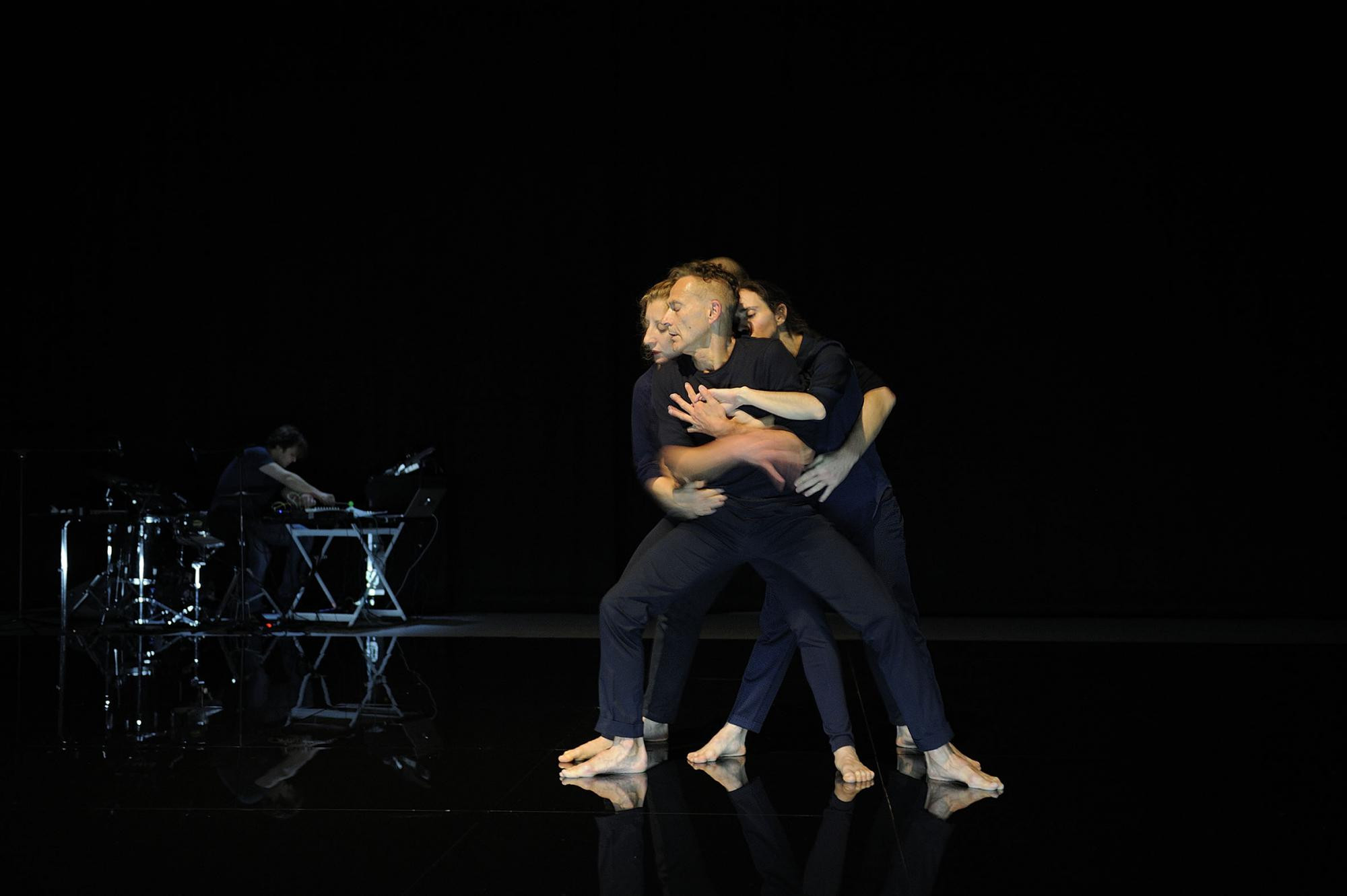 Düster beginnt Rubatos neues Stück in den Uferstudios. Aus dem Dunkel schälen sich die Schemen der vier Tänzer, kippen leicht den Oberkörper ab. Begleitklang setzt ein, wie ihn Alexander Nickmann aus vorgefertigten Mustern einspielt, anschwellen lässt oder verzerrt, auch live perkussiv erzeugt und so jene flirrende Atmosphäre schafft, in der sich >flirren< soghaft entwickelt. Immer wieder legen die Gestalten den Arm um sich selbst, als wollten sie sich schützen. Elektronische Impulse halten sie ruckhaft in Gang und vereinen sie zum Gruppenkörper in enger Verquickung. Hände suchen sich, umschlungen tapst die blockhafte Gesamtfigur vorwärts, wandert breitbeinig durch den Raum, der sich über dem schwarzen Boden erhebt. Glänzend ist der und spiegelt das Geschehen. Erst nach Wicklerformen zu pulsendem Klang löst sich die Skulptur auf, ihre Teile taumeln wie versprengte Atome umher, recken die Arme zur Seite. Dann werden sie zu klanggesteuerten Robotern, fallen, strampeln, als sei der Boden elektrisch geladen. Jäh stoppt der Ton, erlischt das matte Licht.