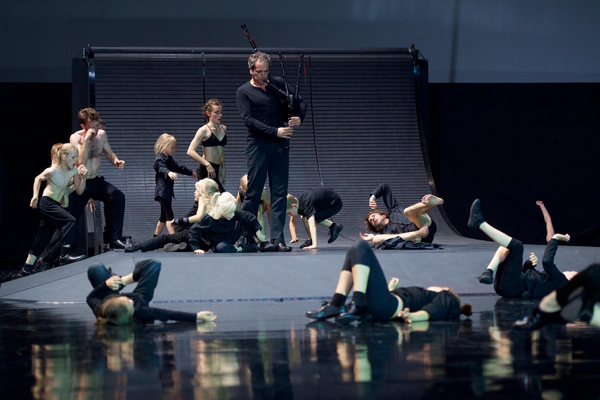 Wie einem Rattenfänger von Berlin schließen sich dann alle dem Dudelsackspieler zum gespenstischen Umzug an, als sei nun der Veitstanz ausgebrochen. Auch die Erwachsenen, mittlerweile mit freiem Oberkörper, tanzen taub und blind im Wirbel mit, rasen durcheinander. Die Musik wird zum Gedröhn, den Spieler zieht einbeinig der Kran hoch – da schlägt die Situation unerwartet und doch sehnlich herbeigewünscht um. Die neun Erwachsenen liegen erschöpft auf dem Boden, die 15 Kinder beginnen mit demselben kruden Spiel, zerren, stapeln und verdrehen ihre einstigen Peiniger, überlassen sie in all den verqueren Posen der Unbeweglichkeit ihrem Schicksal. An der Seite tanzt ein kleiner Rotschopf die Befreiung, der Dudelsackmann baumelt am Seil, die Musik verebbt, das Licht erlischt über einer Szene der Stille und eines Scheinfriedens. Der kindlichen Rache an einer kinderfeindlichen Welt?