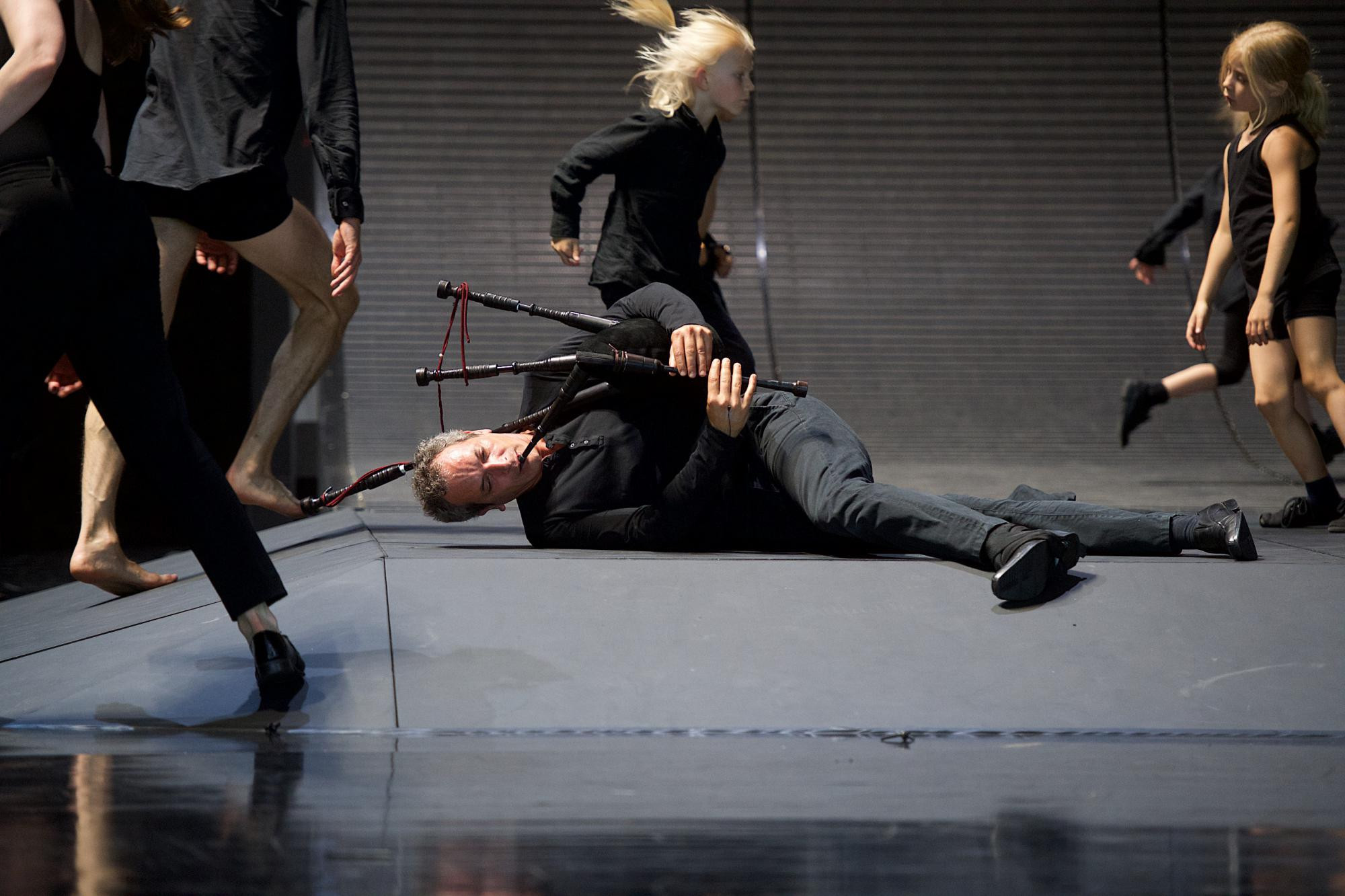 Doch noch einmal die Volksbühne mit Tanz. Kurzfristig kam die Einladung zur Fotoprobe von Boris Charmatz' neuestem Werk „enfant“ für einen Dudelsackspieler, 9 TänzerInnen und 15 Kinder. Beginnend mit einer Kranmaschine, die die TänzerInnen hochzieht, einem schrägen Rollband und einem Schwingtisch, der die TänzerInnen durchschüttelt. Die Kinder sind zunächst Objekte, welche von einem zum anderen gereicht und über die Bühne getragen werden. Später folgen die TänzerInnen und Kinder gemeinsam einem Dudelsackspieler, bevor das Stück rasant wird; in wilden Bewegungen der Kinder