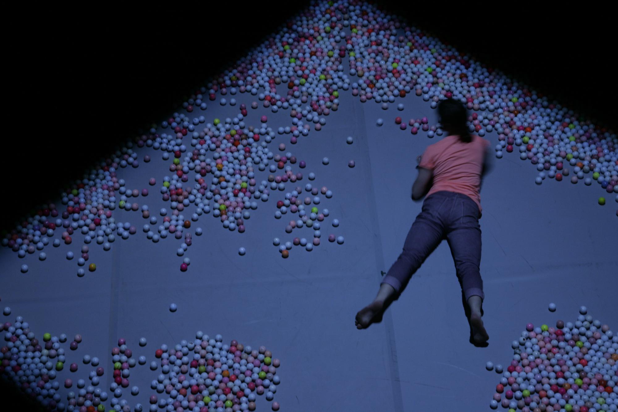 Der Raum des Labortheaters ist so gut wie leer, bis auf einen in der Mitte gestalteten Raum, das Publikum kann sich frei bewegen. Ist das in der Mitte ein Turm? Ein Verlies? Langsam erkennen sich die Menschen in den Projektionen auf den Außenwänden dieses Raumes wieder, direkt oder indirekt, Schatten, Umrisse, Projektionsinstallationen. Bald verlassen die Schatten den Boden, verlieren die Schwerkraft, schweben und schwanken hoch auf den Wänden. Dann nimmt man den Tänzer wahr. Ist er ein Gefangener? Zunächst am Boden, dann, wenn auch er sich der Abbilder seines Wesens an