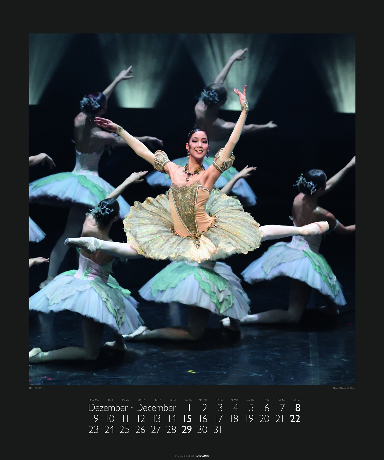 Nicht alles ändert sich unter neuer Intendanz: Auch Tamas Detrich bleibt der Tradition treu, in einem Jahreskalender die Leistungen seiner Stuttgarter Kompanie herauszustellen. Zwölf edle Motive, fotografiert wiederum von Bernd Weißbrod, begleiten durch die nächsten Monate, werben für den Besuch der Vorstellungen und öffnen gleichsam den Blick auf ein vielfältiges Repertoire. Es reicht vom klassischen Handlungsballett bis zur Oper als Koproduktion. Maximiliano Guerras „Don Quijote“ rahmt das Jahr: Anna Osadcenko respektive Ami Morita dürfen darin brillieren. Maurice Béjarts „Boléro“ platziert auf dem legendären roten Tisch Friedemann Vogel bzw. Jason Reilly. Der bildet in höchster Attitude mit tattooverziertem Oberkörper auch das Cover. Freilich dürfen die Stuttgarter Superstars in weiteren Rollen posieren, Vogel mit Elisa Badenes in Balanchines „Tschaikowsky Pas de deux“, Reilly mit Alicia Amatriain in Crankos „Hommage à Bolshoi“. Beeindruckt da Amatriains strahlende Arabesque, so ist sie in Neumeiers „Kameliendame“, gepartnert vom Pariser Étoile Mathieu Ganio, ganz die verletzlich liebende Kurtisane. Badenes wiederum weiß sich von Adhonay Soares da Silva in einer bravourösen Schlusshebung aus „Don Q.“ sicher präsentiert. Wie vielseitig Demis Volpi arbeitet, beweisen eine gespenstische Gruppenszene um Roman Novitzky aus „Krabat“ sowie das Duett des Aschenbach-Tenors Matthias Klink, der in Brittens Oper „Der Tod in Venedig“ vom apollhaften Tadzio des David Moore umgarnt wird. Bleiben noch Miriam Kacerova in Neumeiers „Othello“ sowie Hyo-Jung Kangs und Pablo von Sternenfels‘ innige Verschlingung in Sidi Larbi Cherkaouis Version des Debussyschen „Faun“. 2019 kann kommen!
