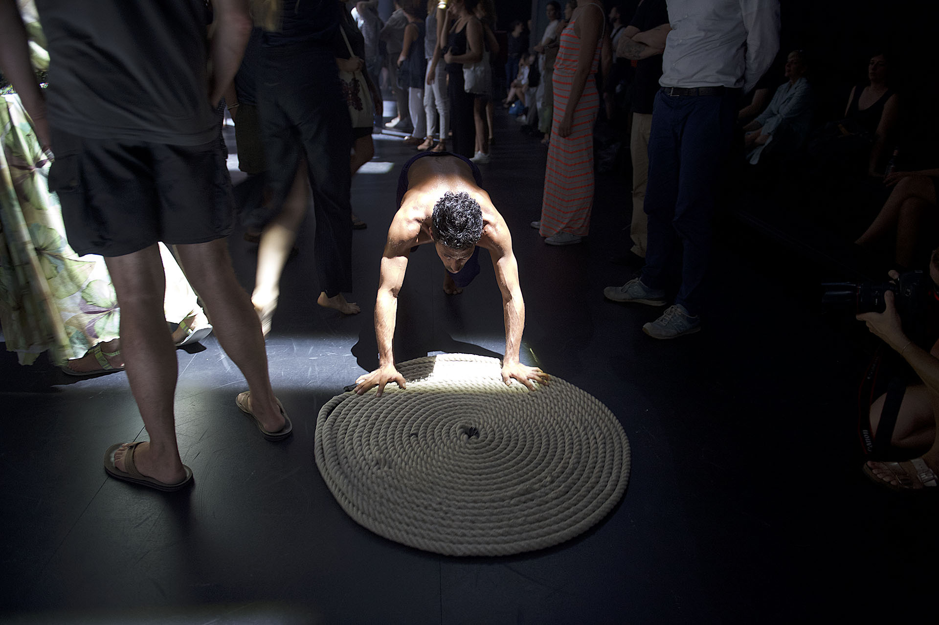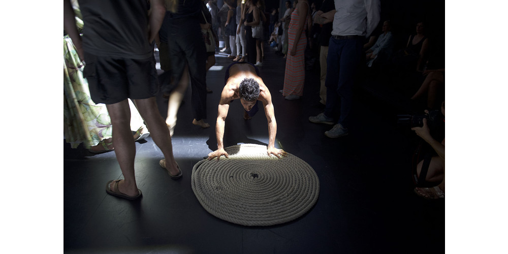 Eine Tänzerin schleppt an Fäden Schuhe hinter sich her, ein Waschbecken rollt herein, Rundspiegel tauchen auf. Überall ereignet sich etwas, Zuschauertrauben bilden sich, jeder wählt, was er sehen möchte, Zufall komponiert das Stück. Mit Kreide umranden Akteur*innen den Standort der Zuschauenden als Momentaufnahme auf der Spur durch den Abend; eine Gliederpuppe wird in einen der Glasarreste hineindrapiert. Als nur eine ferne Lichtquelle aufleuchtet, drängen alle, Spieler*innen wie Publikum, dorthin, sind eins geworden. Die Gasse wird zur Prozession durch aus Leibern geformte Tore, wieder für alle, die mitmachen möchten. Selbst eine Radlerin quetscht sich durch. Dann bildet sich ein Belag aus menschlichen „Steinen“, über die geschritten wird, ehe in zwölf Paaren jeder seinen Partner traktiert, dann fürsorglich trägt. Temporäre Skulpturen ergibt das, die sich auflösen und maschinenhafte Schwünge ausführen. Tänzerisch dynamisch wirkt dies Räderwerk in den Raum hinein, wird rangelndes Seilziehen zweier Parteien, dann Sprung über ein viele Meter langes Seil.
