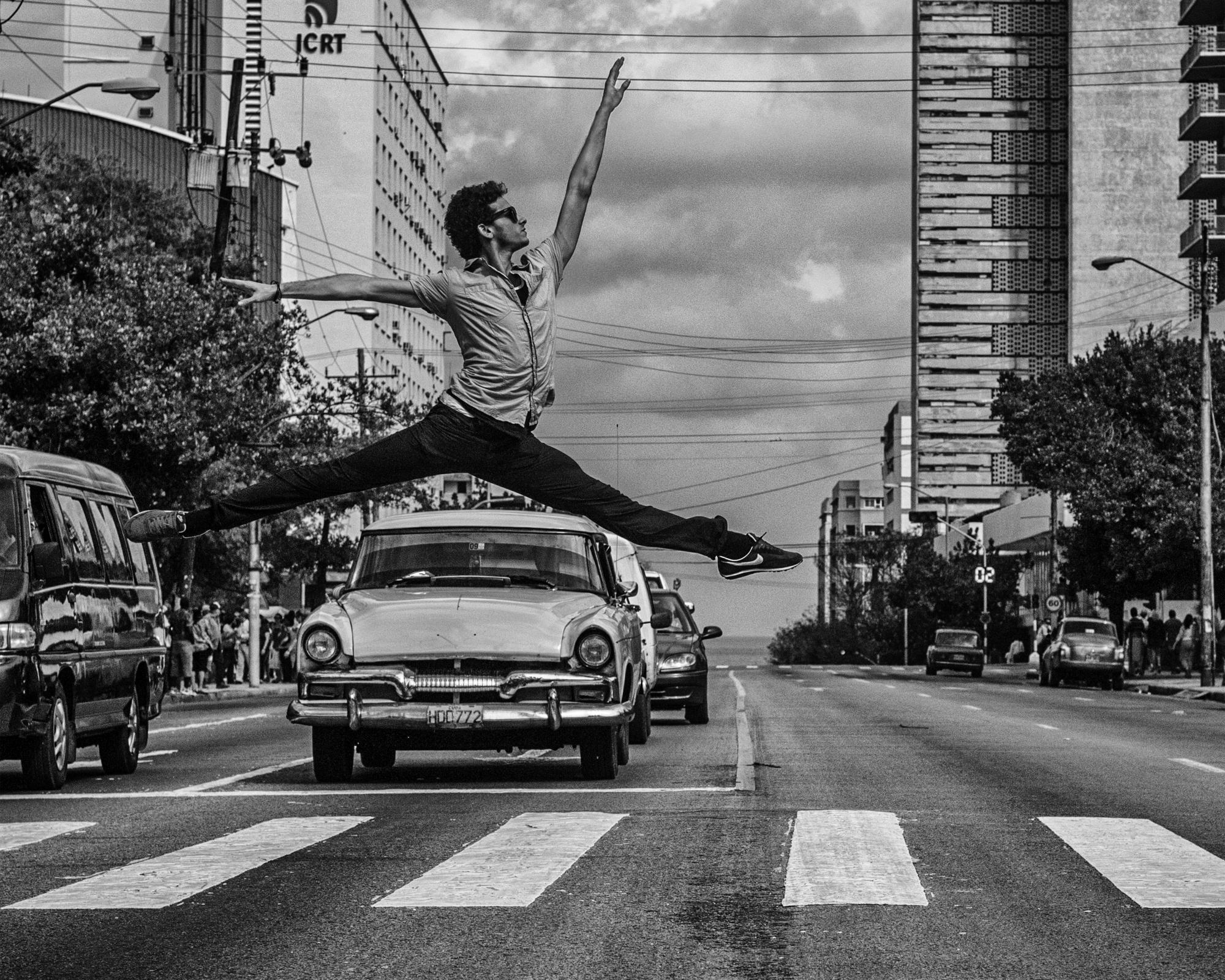 Alle präsentieren sie die Tänzerinnen und Tänzer in markanten Stadträumen und unerwarteten Situationen. Da ist zum einen die Ufereinfassung, der legendäre Malecón, an dem man flaniert und sich des Abends trifft. Gabriel Dávalos lässt seine Modelle im Spagatsprung hoch über jenem Damm „schweben“, unter geblähter Landesflagge und mit Panoramablick über die Bucht. Ob nun ein Tänzer allein das Querformat dominiert oder drei Tänzer wie auf der Flucht aus dem Bild forteilen, unter drohenden Wolken oder im Gischt des aufspritzenden Atlantikwassers agiert wird - Stolz und Schönheit stehen für die Stadt und ihre tanzenden Menschen, vertreten durch die exzellenten Profis vom Ballet Nacional. Sprünge sieht man in den Gassen der Altstadt mit ihren filigranen kolonialen Altbauten und unterm Gewirr der Stromleitungen; eine von den Säulen eines Torbogens gerahmte Paarhebung vor strahlendem Himmelblau mit weißem Wölkchen; den „Flug“ eines Tänzers über einen Zebrastreifen, ein Auto tief unter den Spagatbeinen. Den Blick durch eine Kolonnade stoppt gebieterisch eine Ballerina im breiten Plié, eine andere hängt waghalsig an einer Fassade, eine weitere reckt sich auf Spitze in einem Rondell der Himmel entgegen.